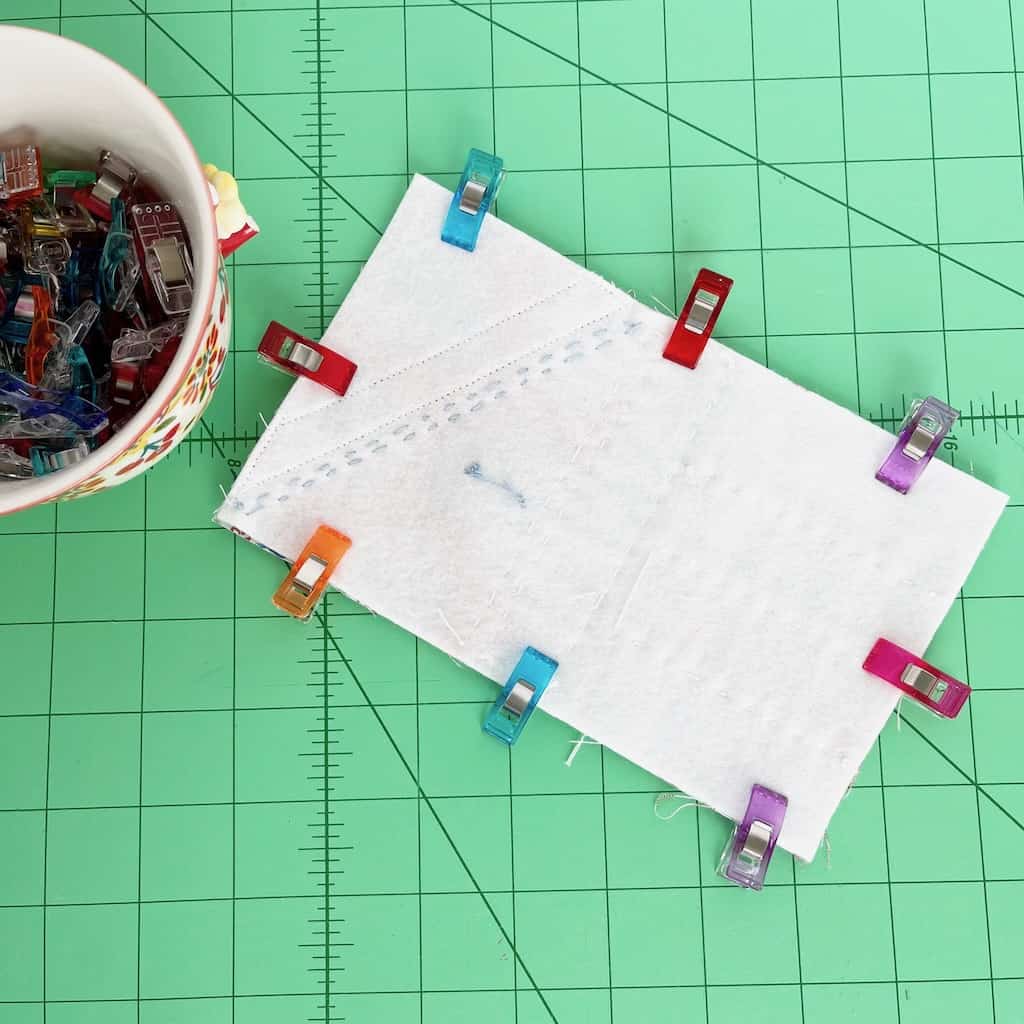 - Trim the fusible fleece and book exterior to exactly 4.5 inches by 7.5 inches. Place your book interior on top of the book exterior, right sides together and sew a 1/4 inch seam all the way around, you will want to use Wonder Clips to keep it from slipping as you sew. Clip corners, being careful not to cut into the seam.