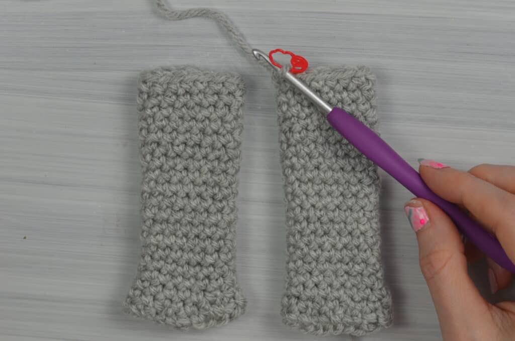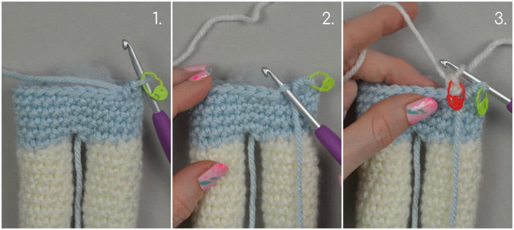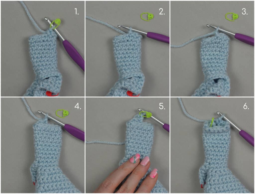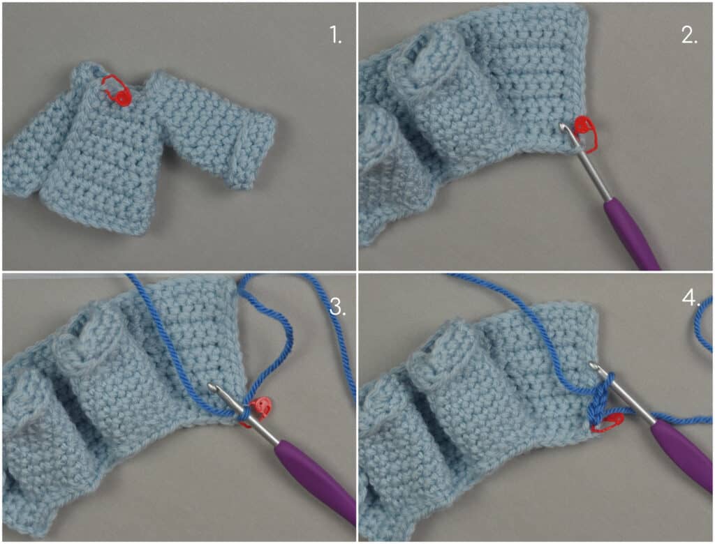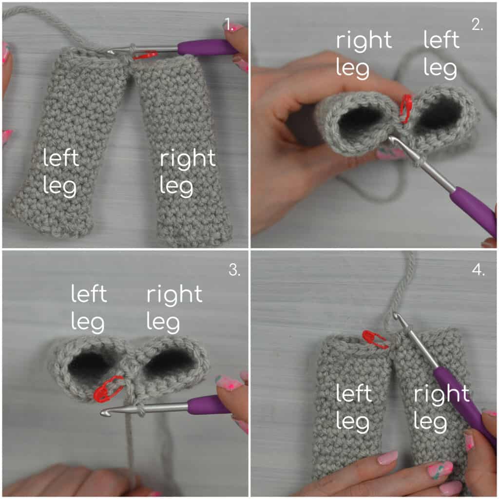 R21: sc into the next 15 sts on the left leg of the pants (images 1 and 2), continue onto the second leg of the pants and sc into the next 15 sts. (images 3 and 4) =30