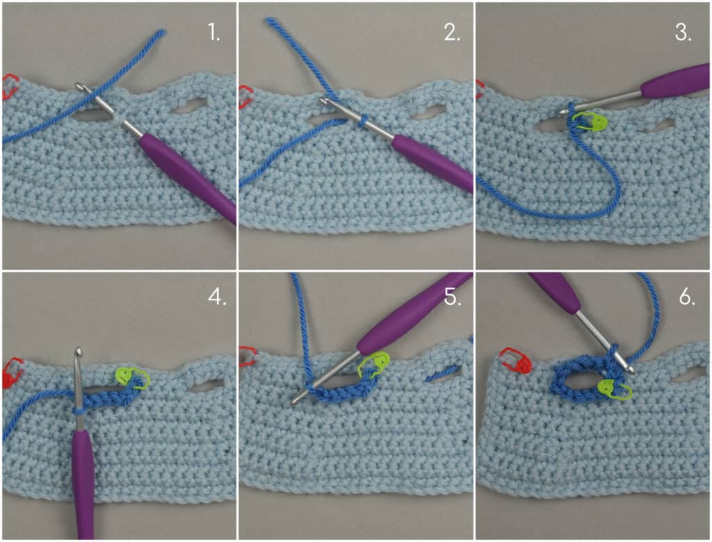 R1: Insert the hook into a corner of the arm hole, yo (image 1) and pull up a loop (image 2), ch 1 (does not count as a st), sc into the same st and into each st around. (images 3, 4, 5 and 6) =13