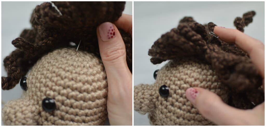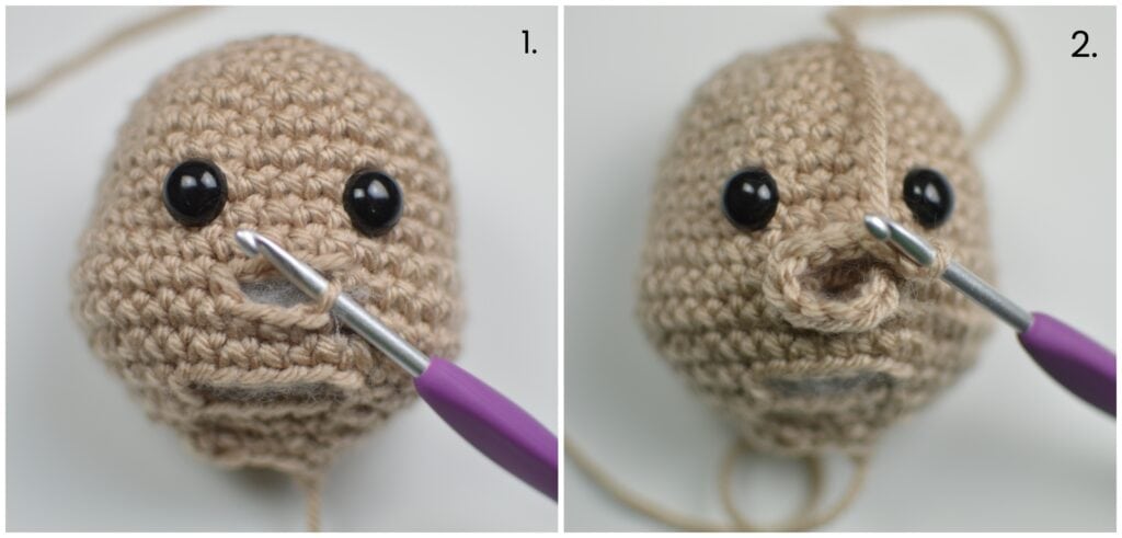 Take the 2 stitch markers out of R9 and replace them with safety eyes.