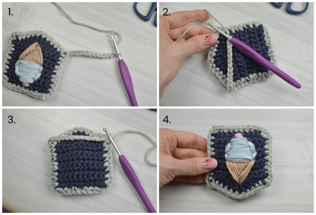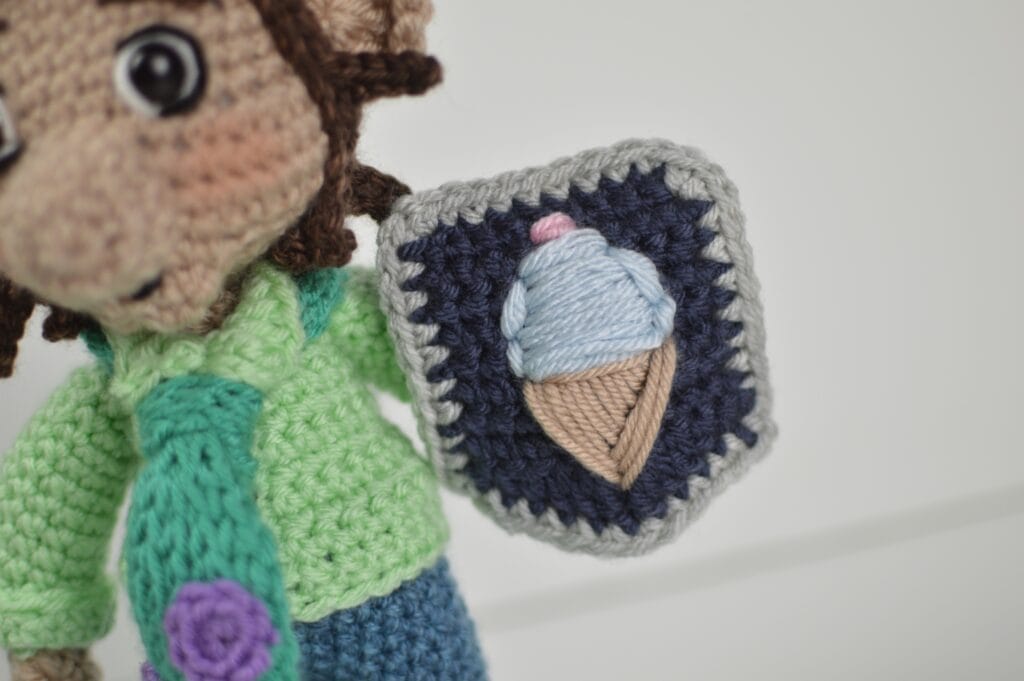 Embroider the gelato cone onto the shield with acorn yarn, baby pink and pale blue yarn. Embroider by first outlining each section, then fill each section in and last, outline each section again.