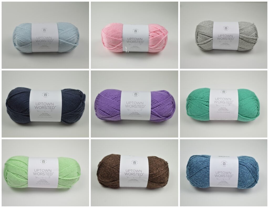 - Universal Yarn Uptown Worsted in Acorn (1), Black (1), Glow White (1), Baby Green (1), Denim Heather (1), Mint Green (1), River (1), Donahue (1), Baby Pink (very small amount), Pale Blue (very small amount)