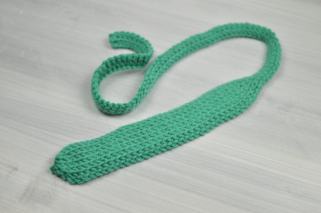 Cut the yarn, pull through the last stitch and weave in the ends before gluing to the tie.