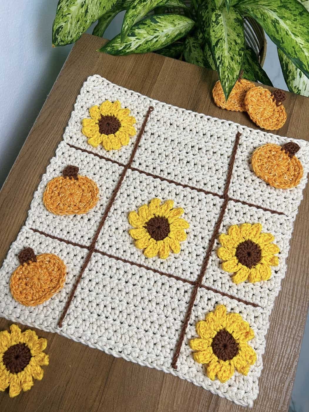 And there you have it! An autumn-themed tic-tac-toe board for you to place on your coffee table, use as decor, or play at family functions! I hope you liked this pattern + happy fall! 🙂