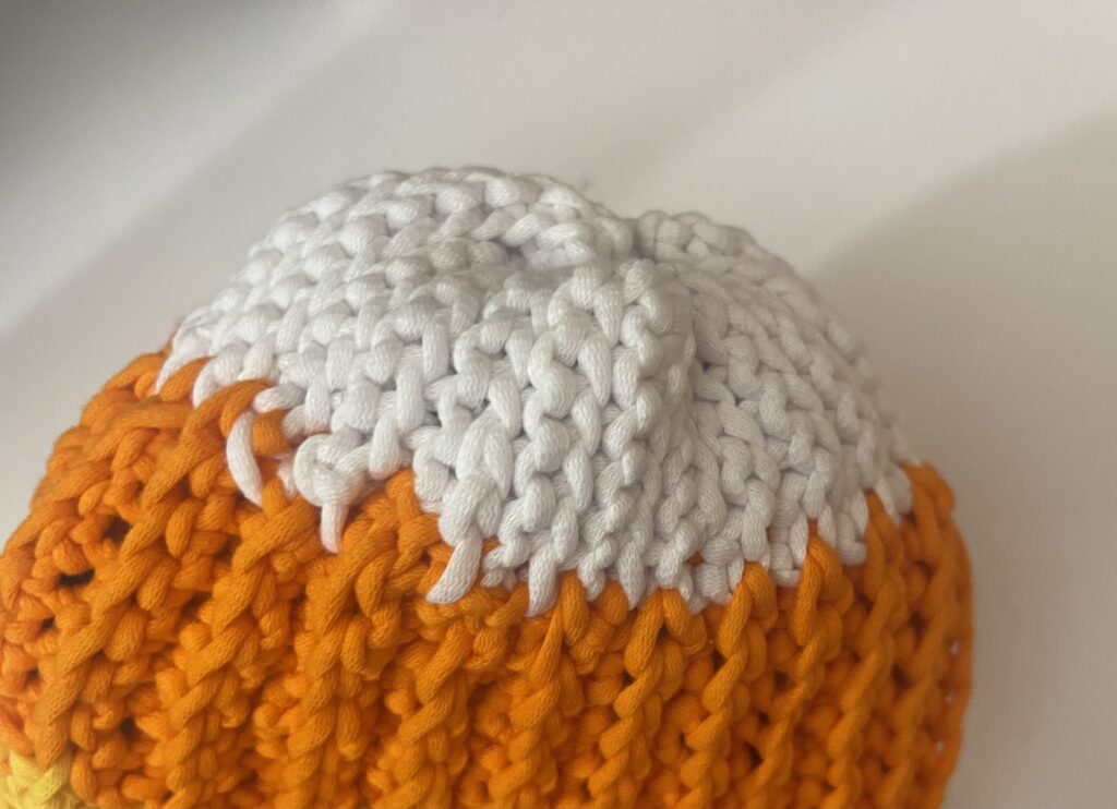 Whip stitch your orange section. Pull your orange yarn off your needle, and thread your last color. Whip stitch it together. Tie off and weave in any loose ends.