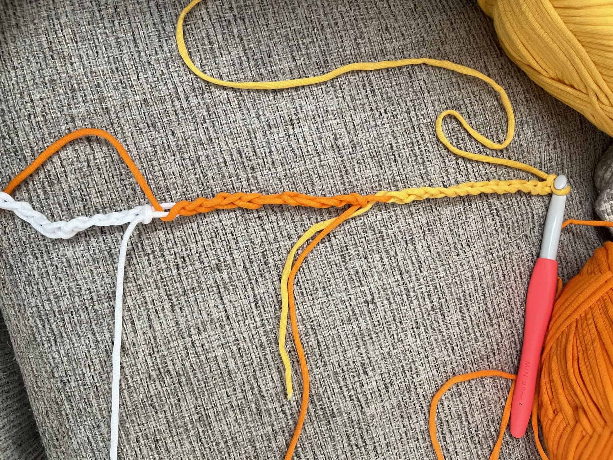 Using white yarn, make a chain of 11. Attach the orange yarn and make a chain of 11. Attach the yellow yarn and make a chain of 13.