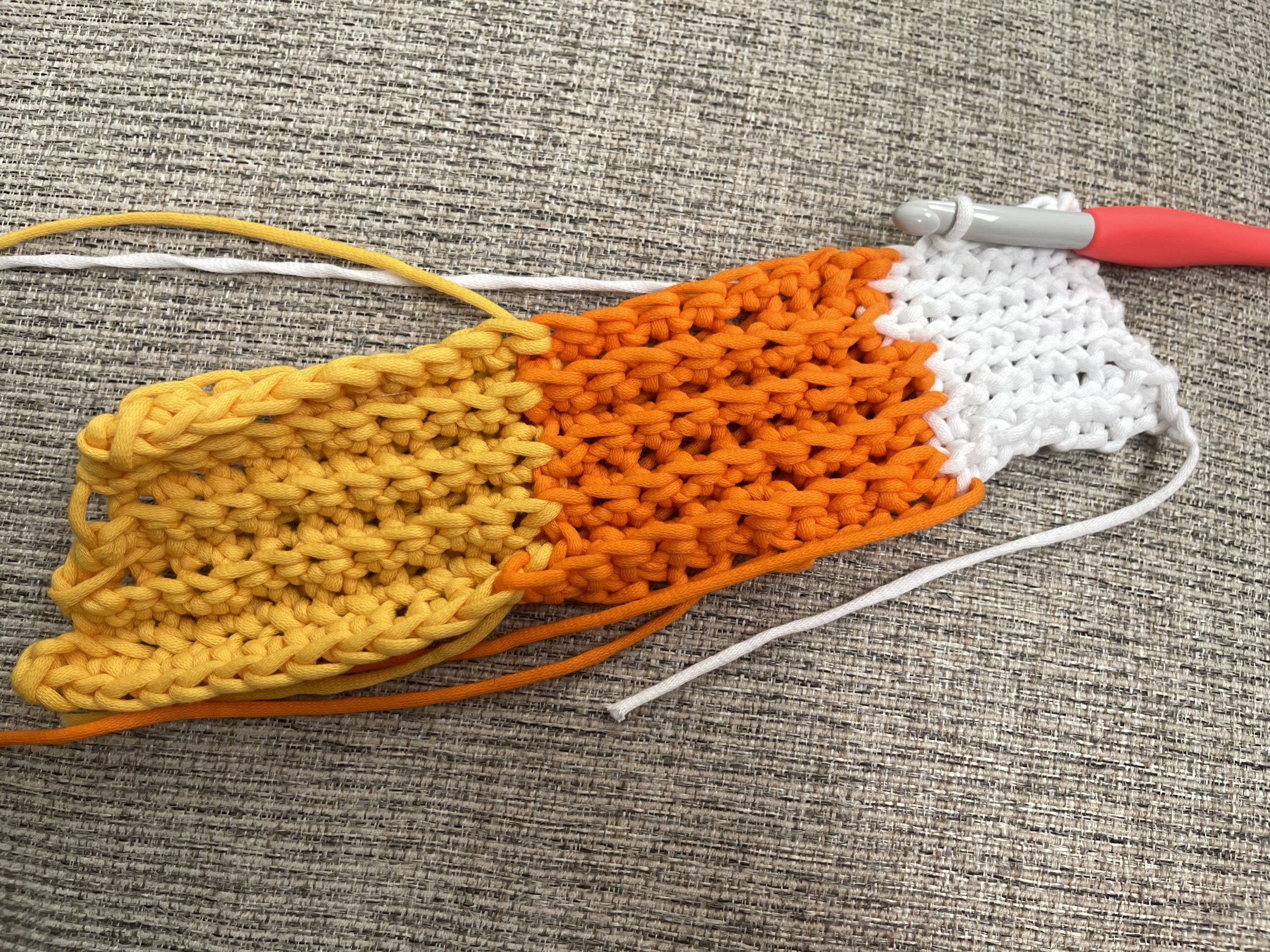 Whip stitch your orange section. Pull your orange yarn off your needle, and thread your last color. Whip stitch it together. Tie off and weave in any loose ends.