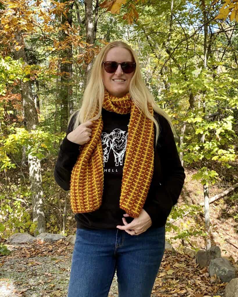 I’m Krista Ann from @explorewithknitsy on IG, and it’s probably fair to say that the fall season is the knitters’ favorite time of the year….The evenings turn cold, the air becomes crisp, the leaves begin to change, and best of all, the warm winter knits come out of the closet! So dust off your larger needles, grab some bulky yarn, bundle up in your coziest pajamas, and bundle up by the fire for an evening in of knitting! This autumn scarf was designed to be a piece that will keep you warm as the season changes. It also makes a great, quick + easy gift for a loved one. You can knit it out of their preferred colors or maybe their favorite sports team colors! Have fun with your color choices – there is no wrong color combo! You also don’t need to stress too much about gauge for this project. And if you want to make your scarf a different size, no problem! This pattern is easy to adjust to fit any sized scarf you want to knit up. During this time of year where life gets hectic, enjoy making a relaxing, simple knit at the end of a long day of holiday shopping!