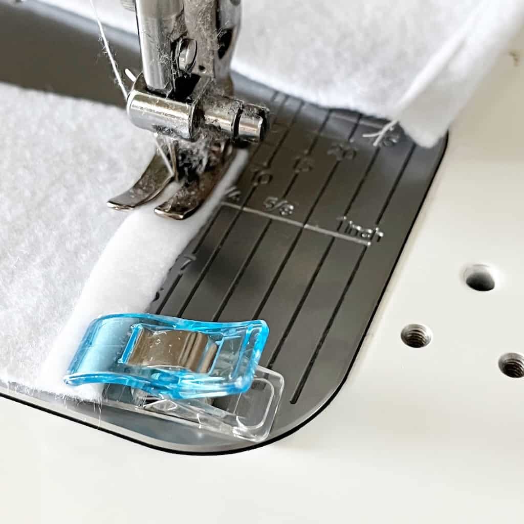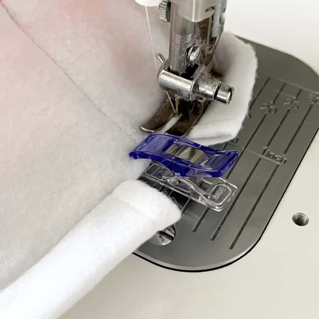 Step Eight: Lay both front and back of the bag together (right sides facing) and use Wonder Clips to hold in place along the sides and bottom. Sew a 1/4 inch seam all the way around the sides and the bottom (do not sew the little cut- out boxes).