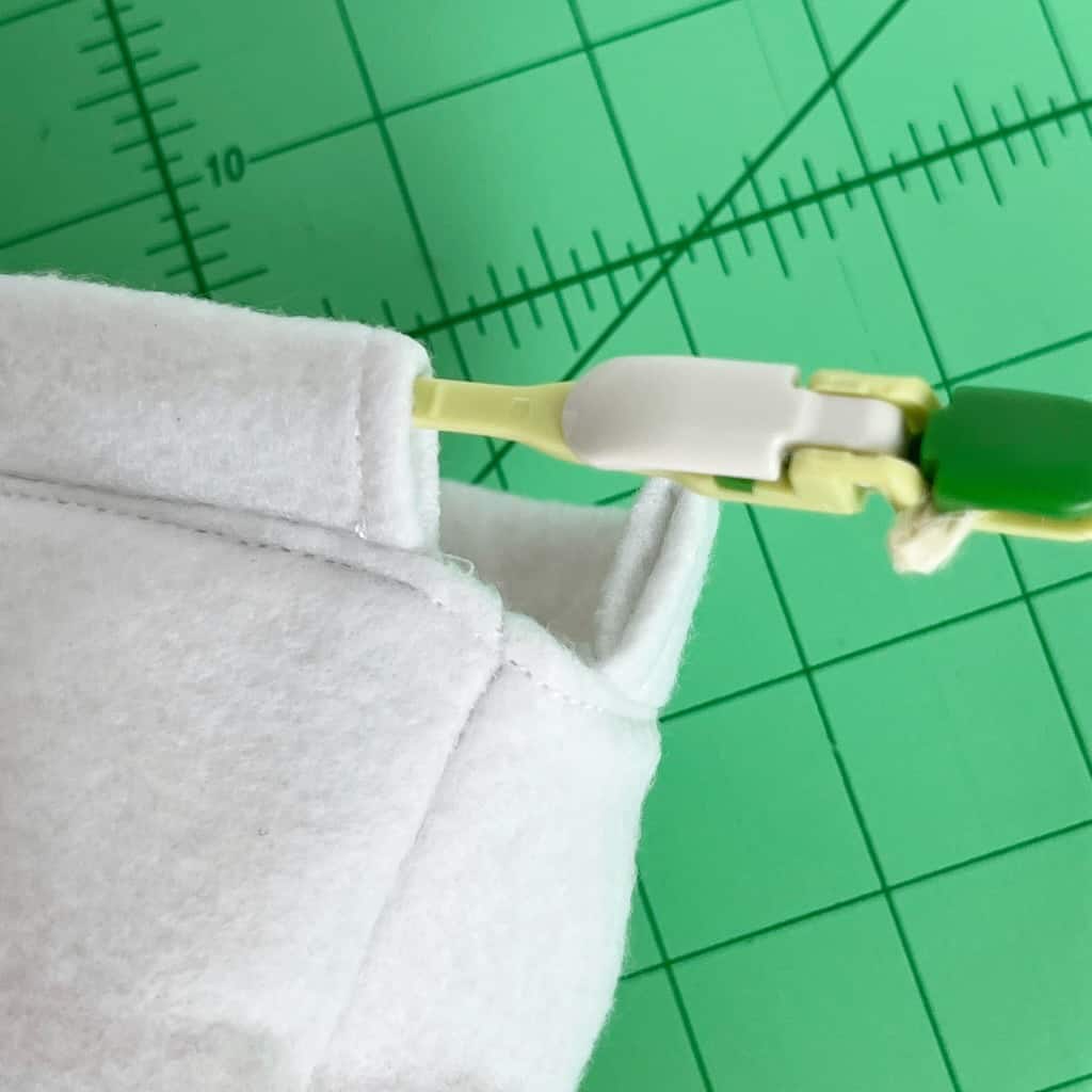 Step Nine: Now we will close up the little boxes, creating perfect little boxy corners. Open the corner up, match the seams, and hold in place with a Wonder Clip. Sew a 1/4 inch seam to close it up. Do the same on the remaining corner.