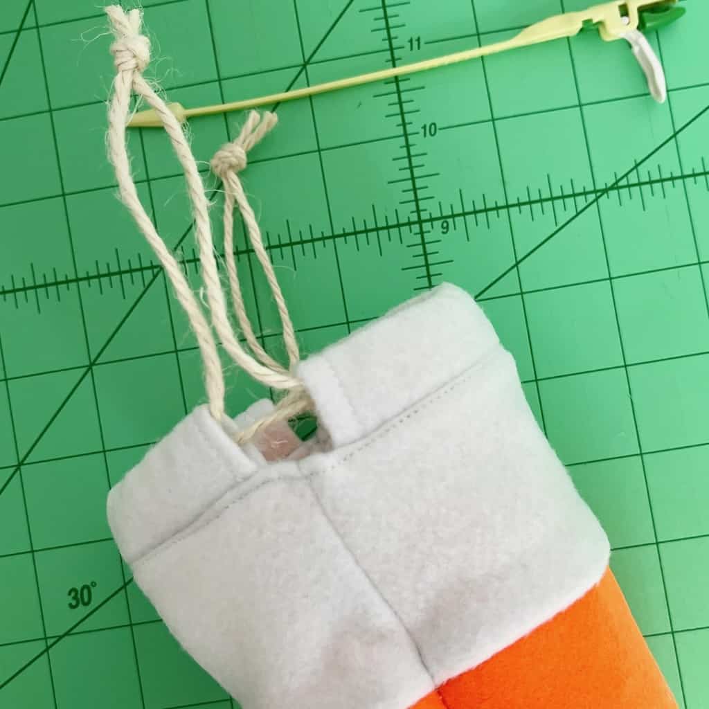 Your adorable little Candy Corn trick-or-treat bag is finished! Have fun and fill it with all kinds of candy and goodies to gift to your favorite Halloween-loving friends! I made little gift tags with card stock sewn to felt and tied with a ribbon. They are super adorable! This little drawstring bag is soooo easy to make. And as long as you have all your supplies out, why not make a bunch of them? I made five and I’m excited to give them to my granddaughters and three of their friends for National Candy Corn Day! Here’s what the final project looks like: