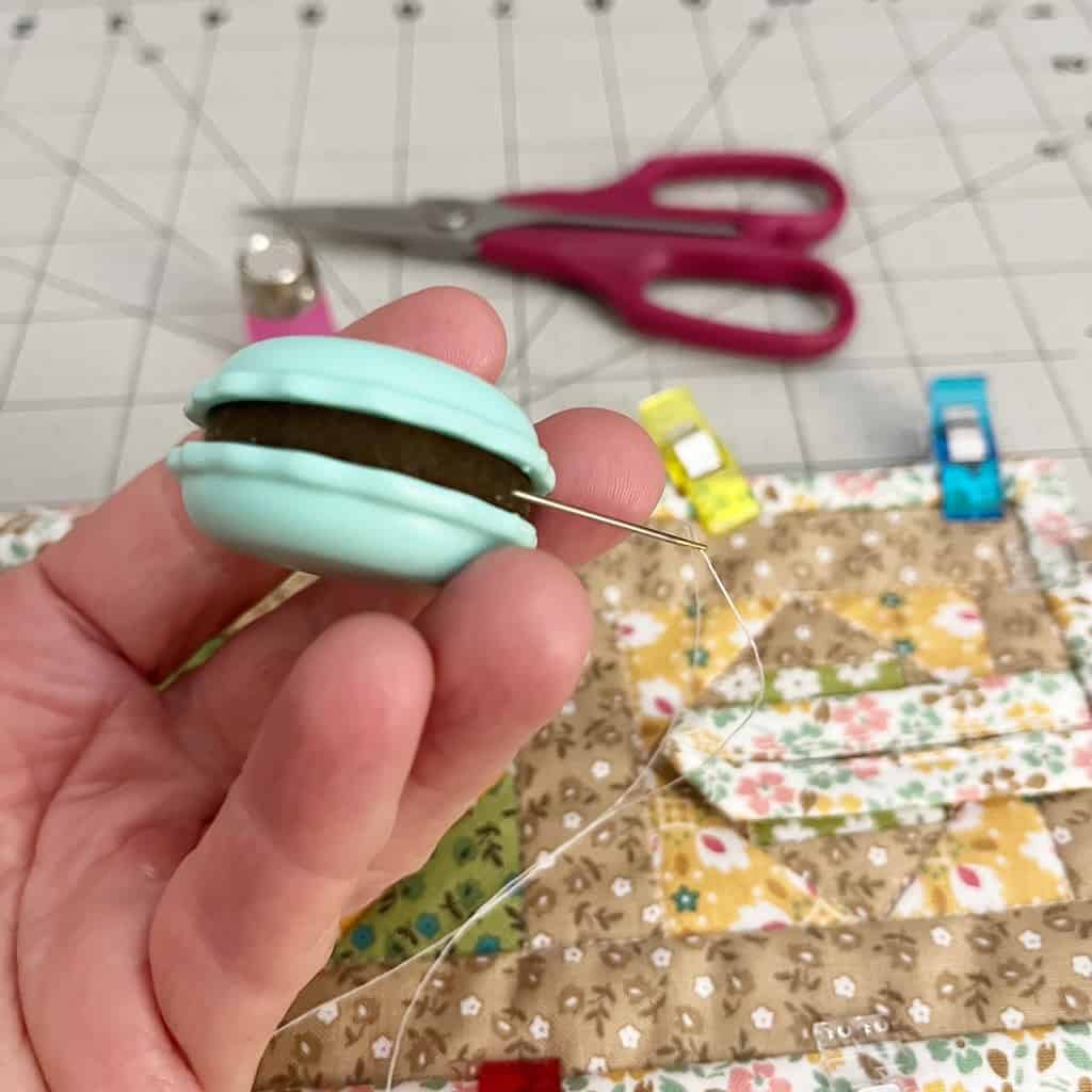 Step 19: Press the seam and fold the binding over to the back of the mug cozy. Use Wonder Clips to hold it in place. Hand-stitch the binding in place all the way around. I love to use the Sweet ‘n Sharp Macaron for all my hand-sewing! If you’ve never used it before, you need to! It’s a magnet on one side to hold the needle, and the center part of the macaron is the greatest needle sharpener!