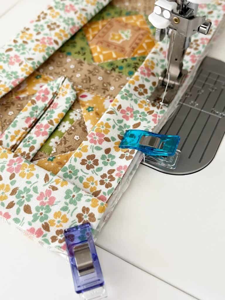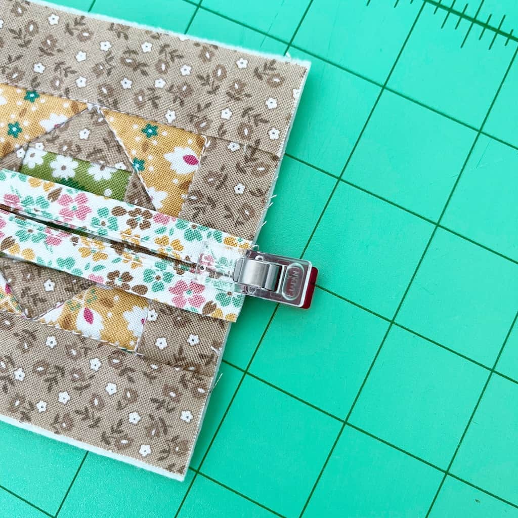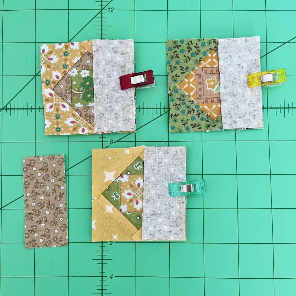 Step 12: Sew a 1.25 inch fabric scrap to the right side of each Economy Block. Sew all three blocks together, then sew the remaining 1.25 inch fabric scrap to the left side of the first block on the strip of blocks. Use Wonder Clips to hold in place.