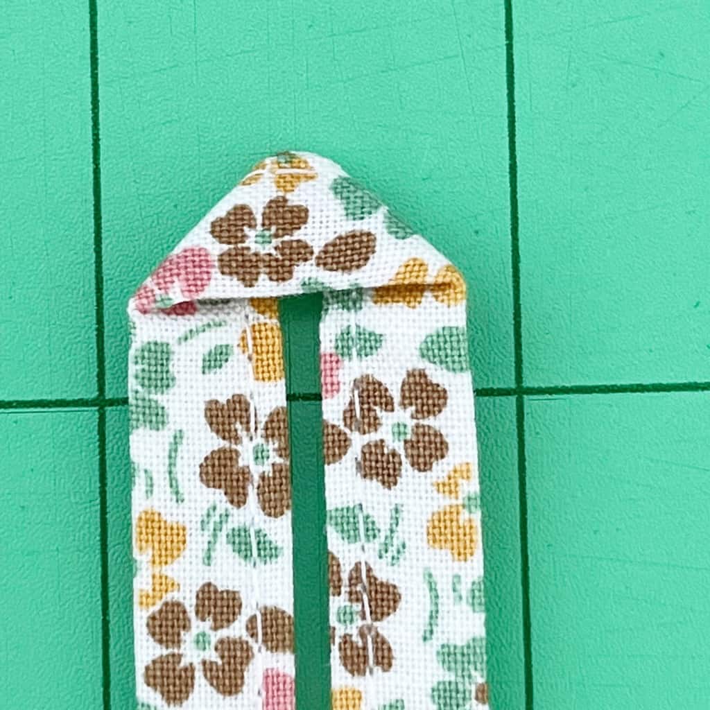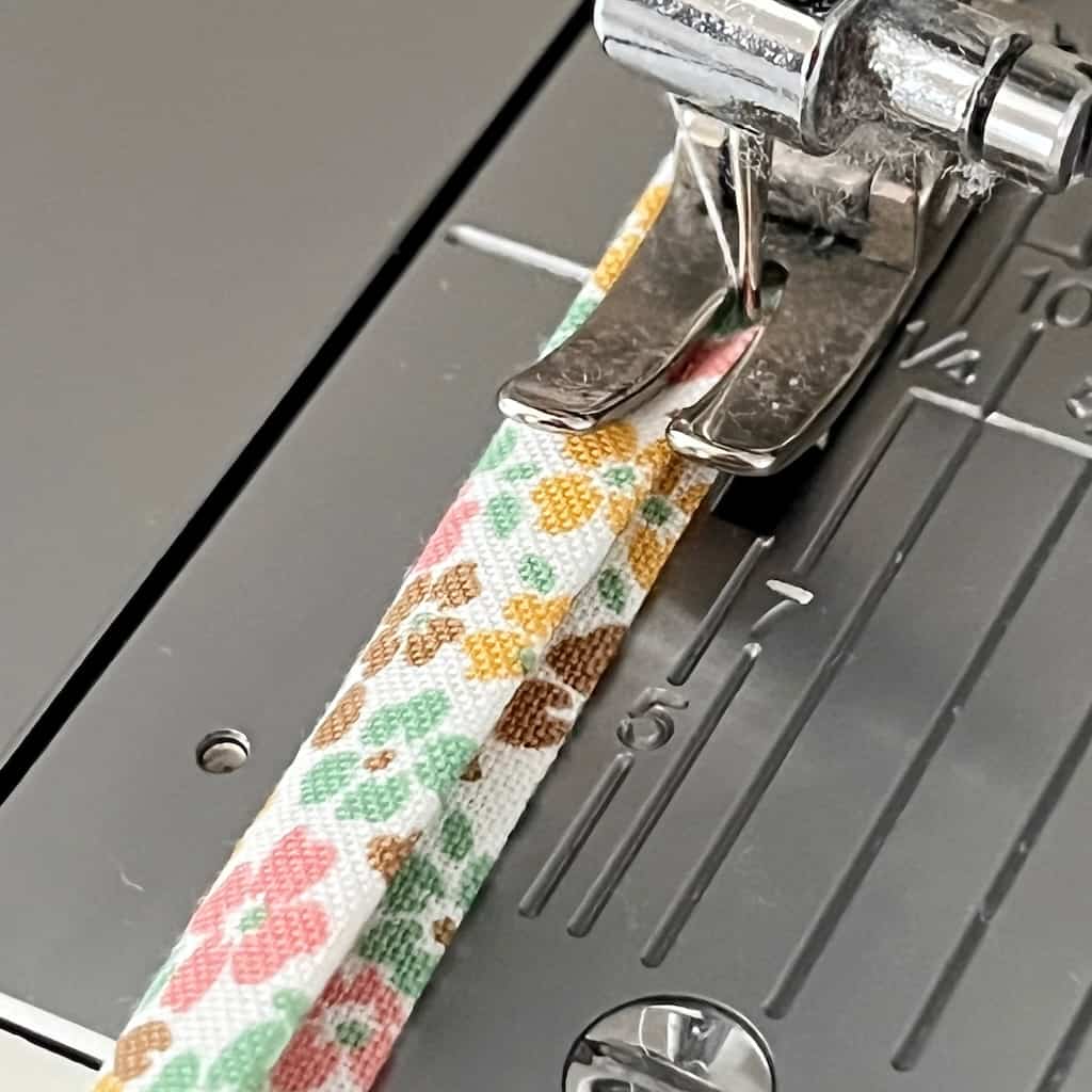 Step 15: Take your button binding piece and fold it in half lengthwise, press. Open it up and fold both raw edges to the middle fold. Press again. Fold in half and give a final press. Sew the entire length along the open edge.