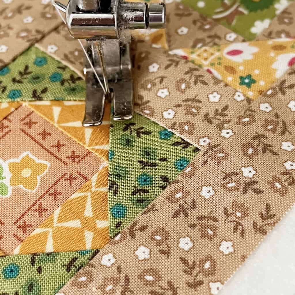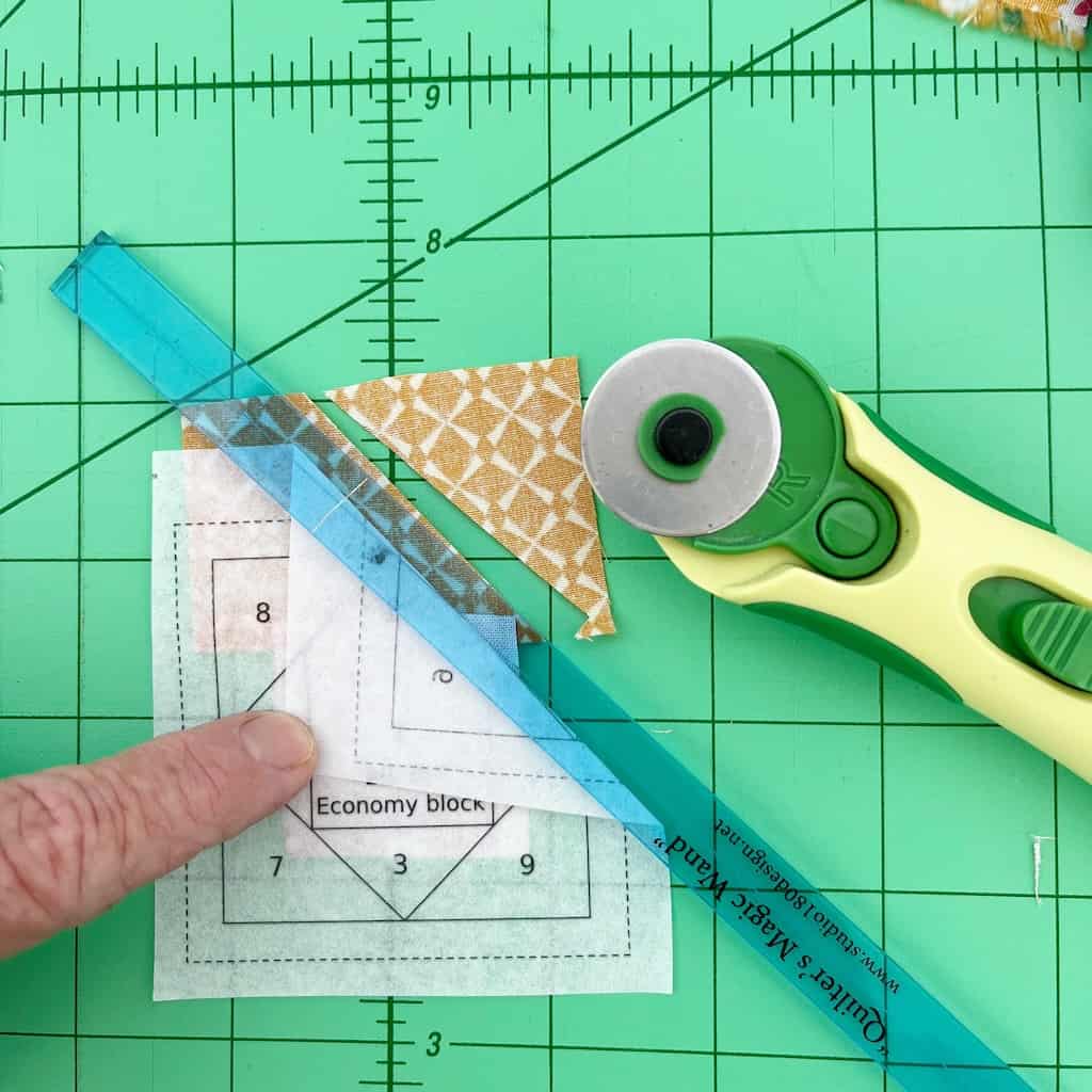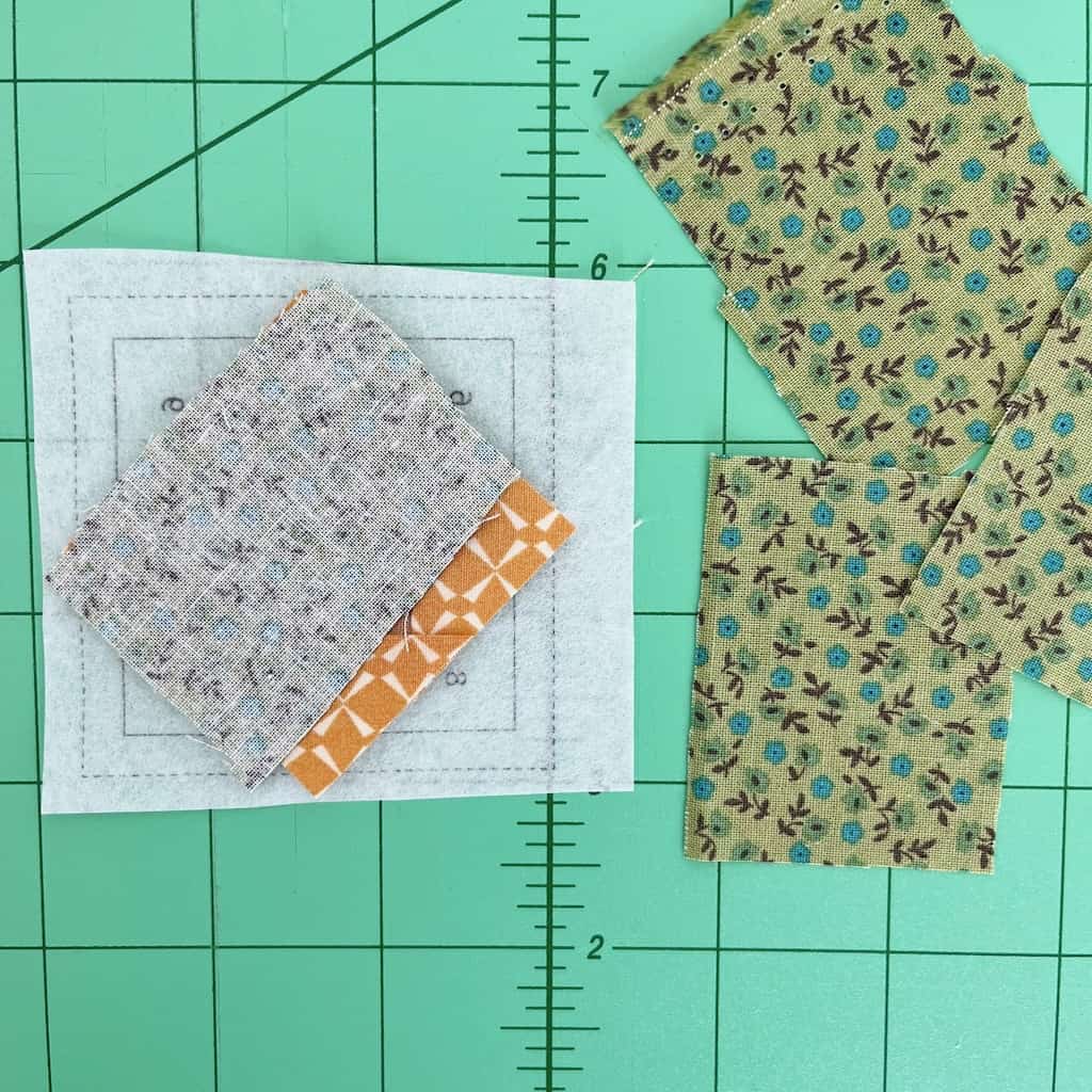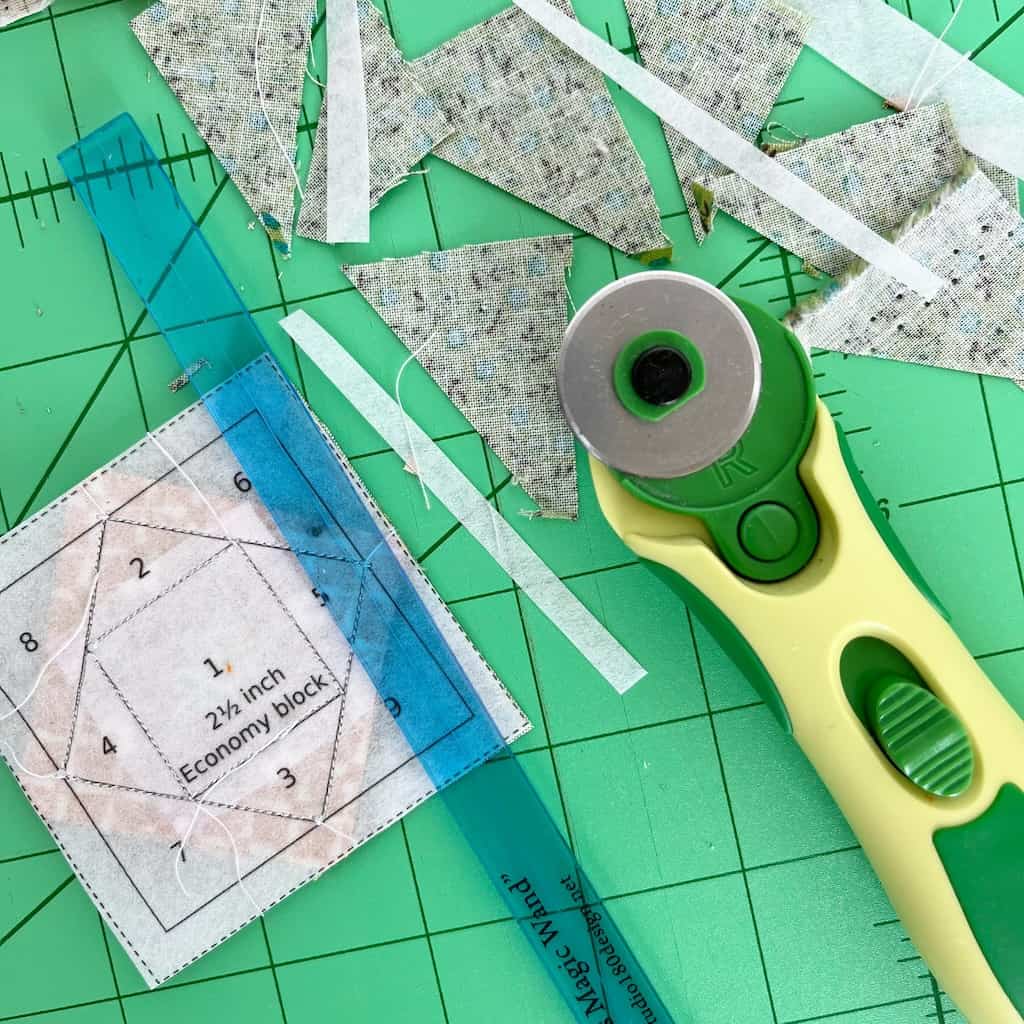 We are going to start with the foundation paper piecing part of this project first. We will be making three tiny Economy Blocks and I’ve used a free pattern that you can download here. Let’s talk just a minute about what kind of paper to use before you print the template. I’ve used regular paper before, as well as purchased foundation paper piecing paper. You can use a stiff interfacing as well. On this project though I used a foundation paper that is kind of like a stiff interfacing that is made specifically for FPP (you can purchase it here). Bottom line though is that you need paper stiff enough to sew, but easy enough to tear when you are finished.