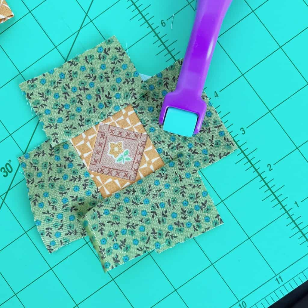 Step 9: Once all four remaining triangles are sewn, you will use your Seam Roll & Press to press the seams down completely. Flip your template over and use your rotary cutter to trim along the dotted line.
