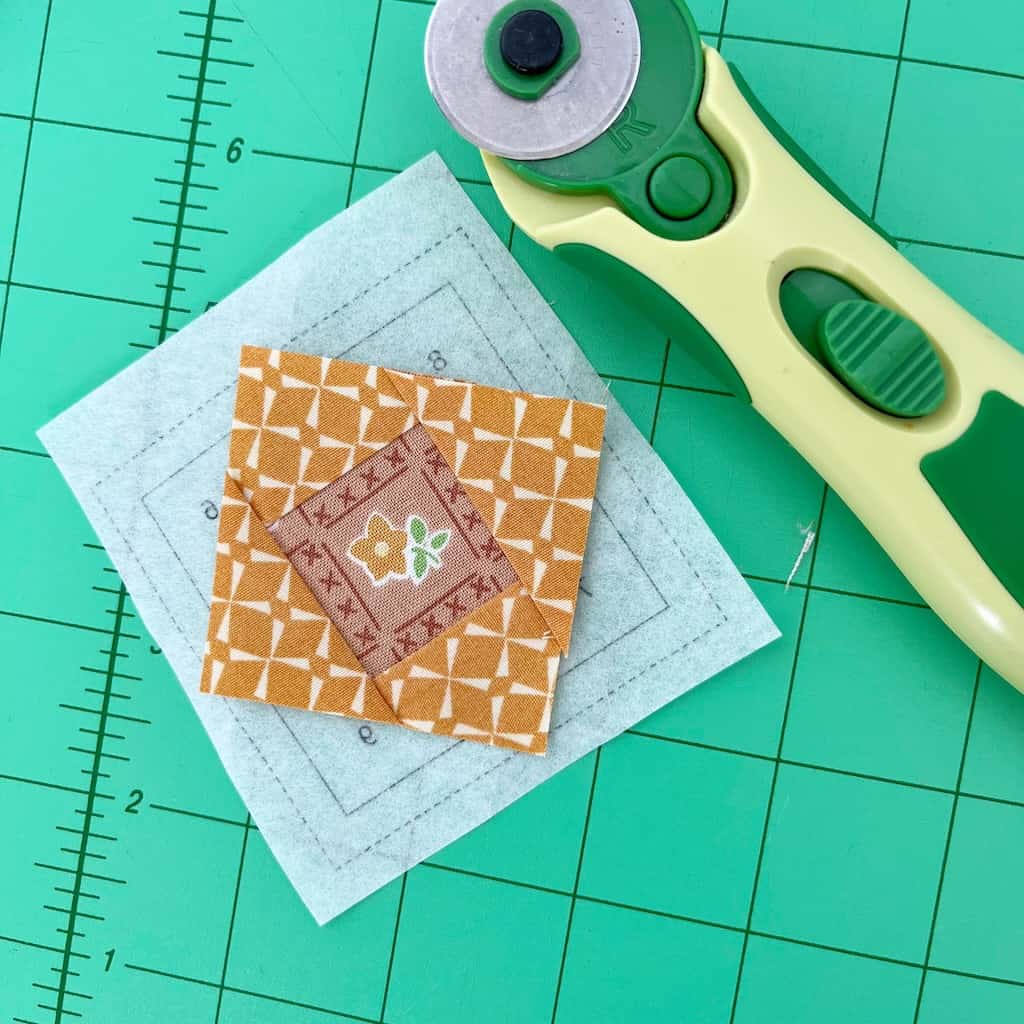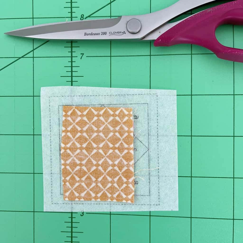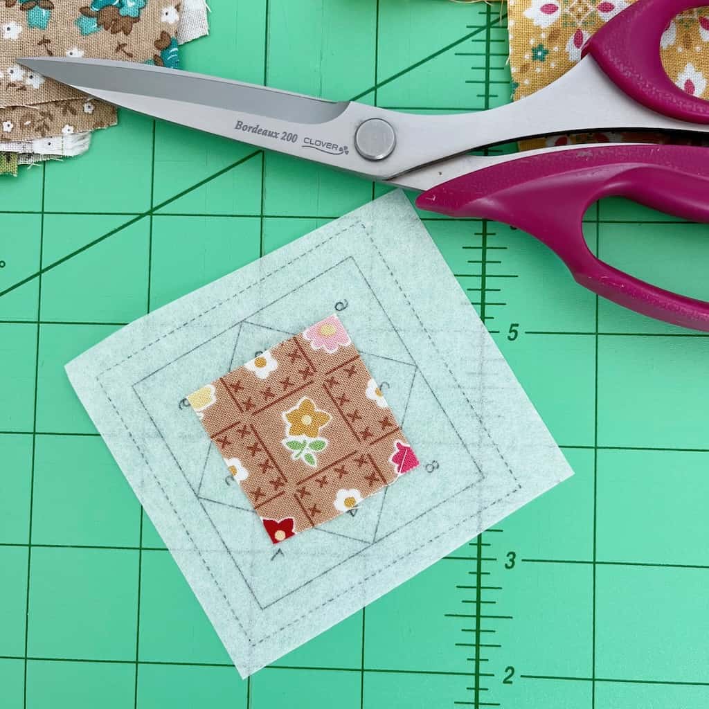 Step 2: Choose a tiny fabric scrap that you want to be the center of your block. Cut this piece so that it’s larger than the 1 inch center. It does not have to be cut square – just make sure it is large enough to cover that center with at least a 1/4 inch overhang. Place it right side up on the back of the printed template. Make sure it is centered (if you can’t tell for sure hold it up to the window and center it).