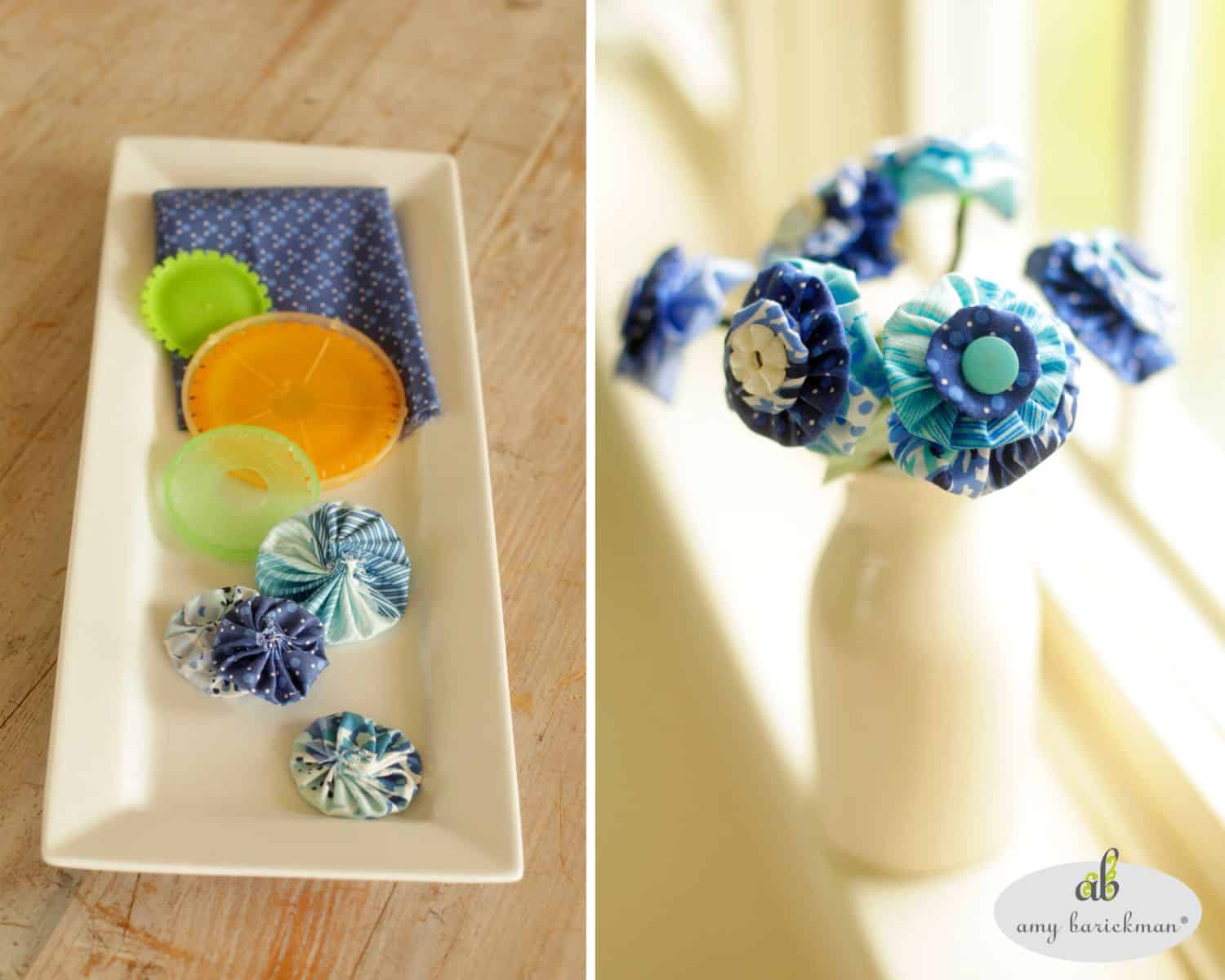 Hi! I’m Amy Barickman, the author of the book Fabric Flowers, and I am so excited to share some of my ideas to make your own Yo-Yo Flower Bouquets! Everyone loves flowers, why not create a handmade gift of fabric flowers?! It’s almost Valentine’s Day, which means it’s the perfect time for a heartfelt gift to celebrate the ones you love most. Using your favorite fabric scraps and buttons, these adorable little flowers are easy to create and can be transformed into a beautiful arrangement that will last much longer than traditional flowers.