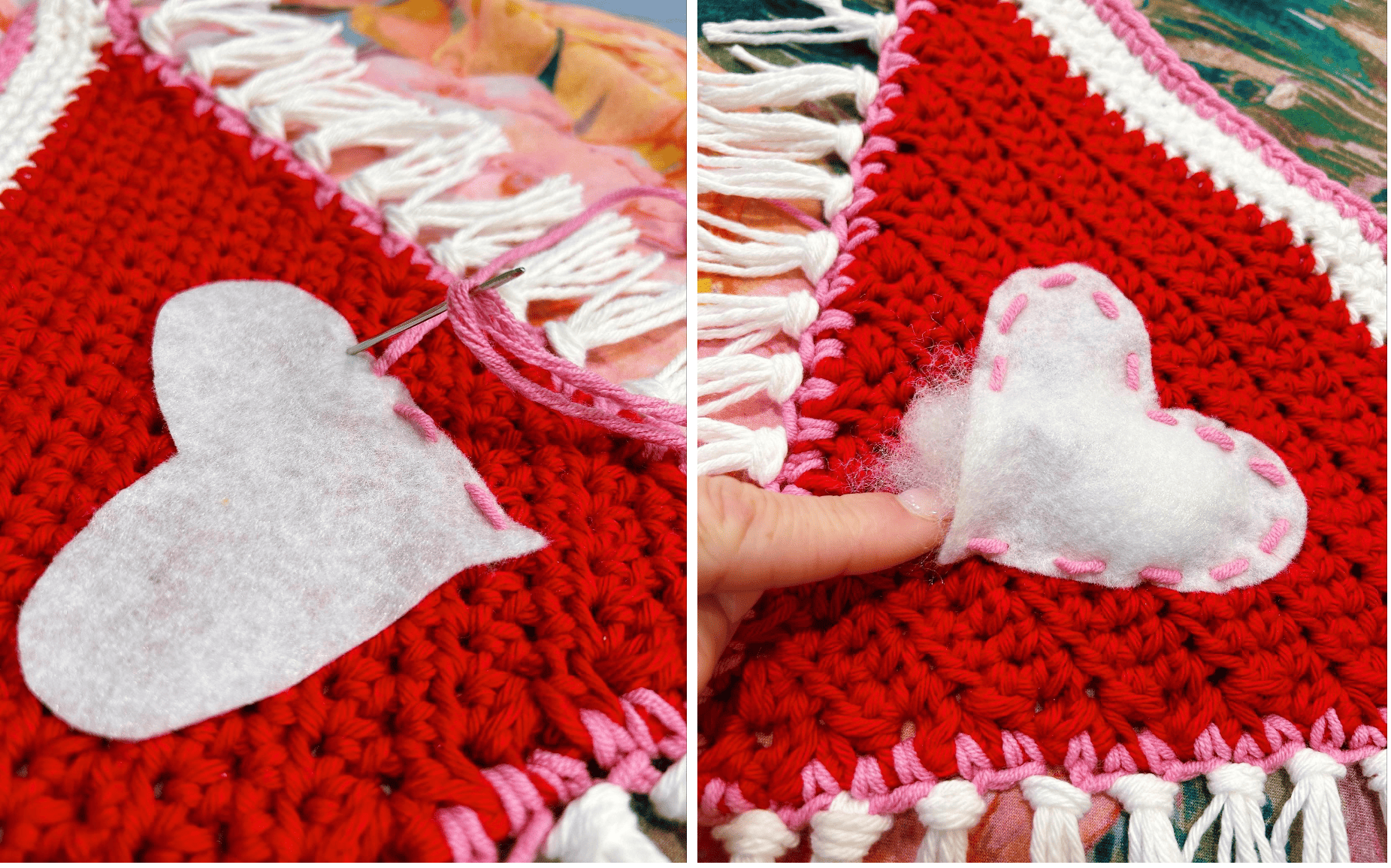 Take your felt and cut a heart any size you would like. Place it on the center of your bandana and with yarn (or thread) sew it in place. Before you sew the entire heart on, take a little bit of poly-fil stuffing and stuff some in there. Then continue closing up the heart.