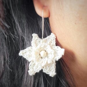 - Use one of the petal peaks (picot) to attach your favorite earring hook, or the lower space (stitch) between the petals if you prefer a drop hook earring.