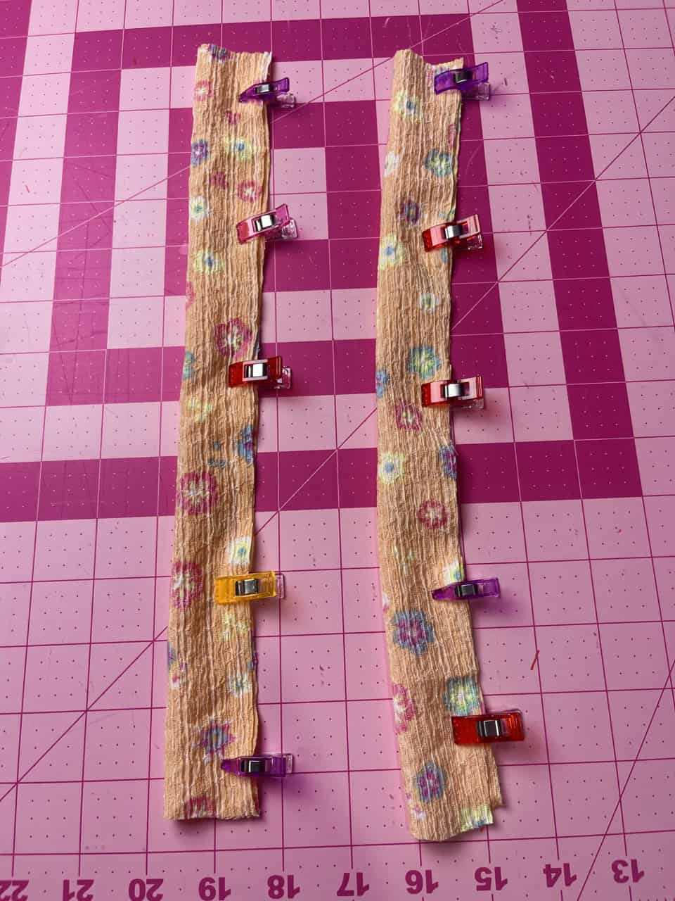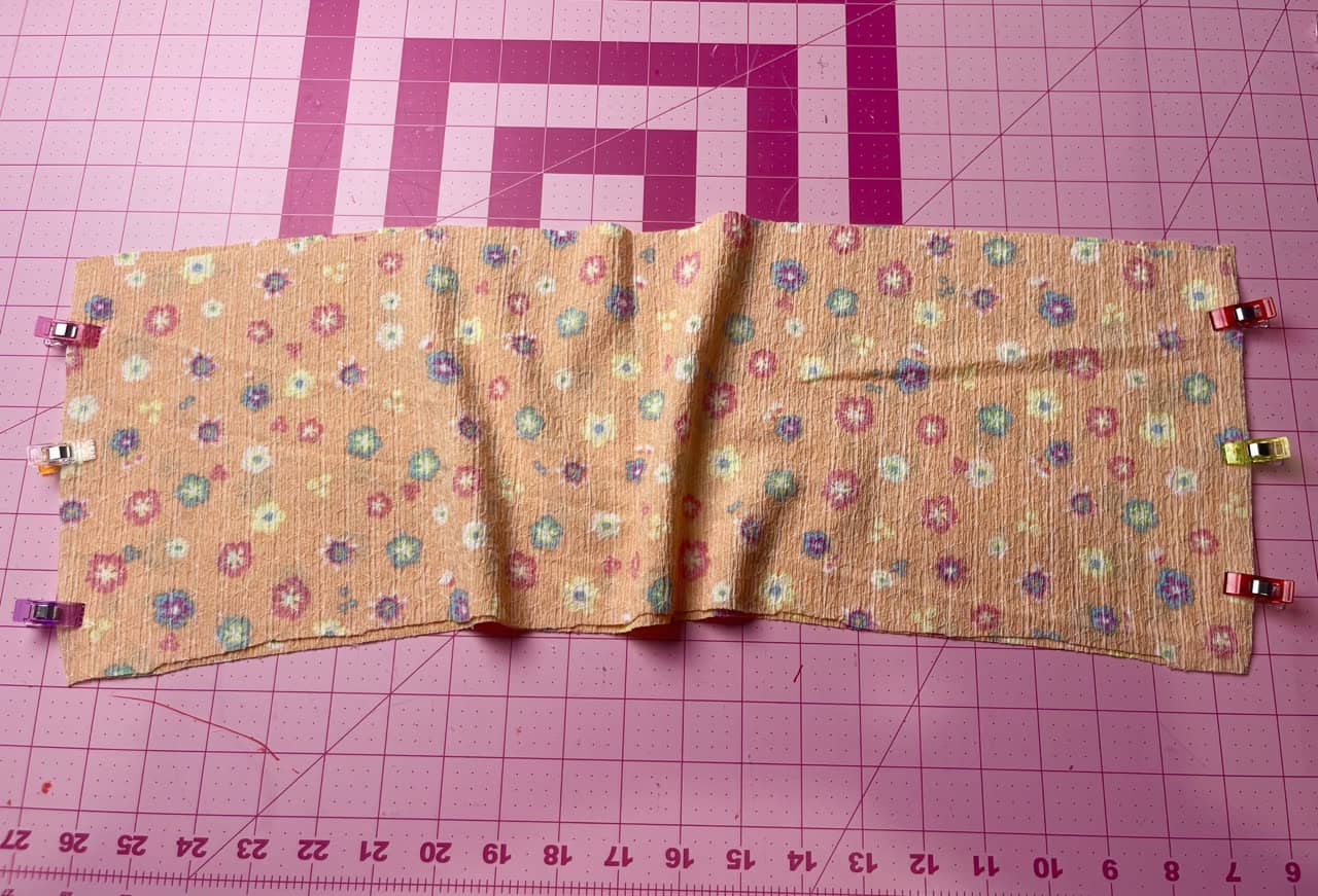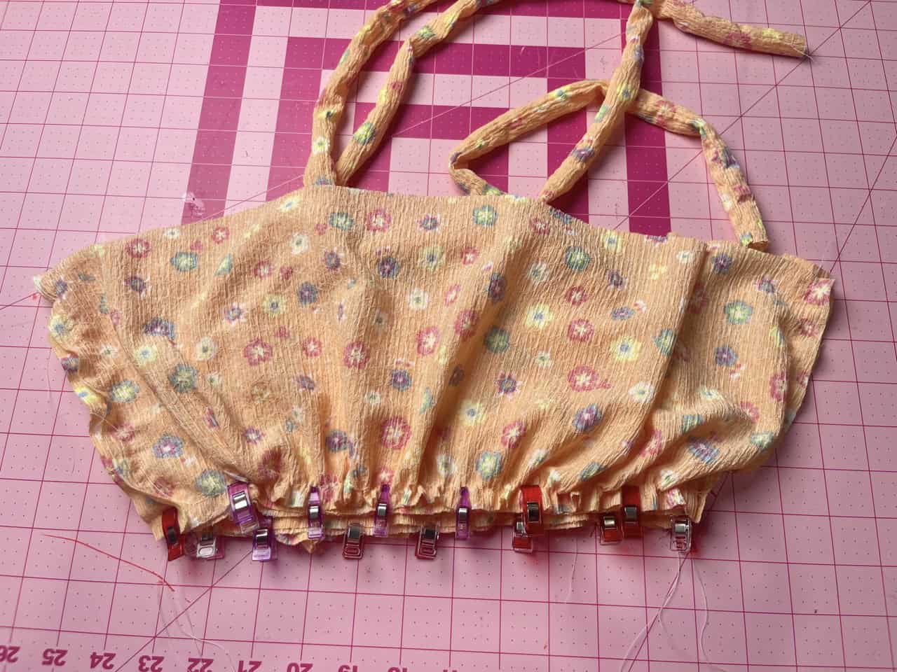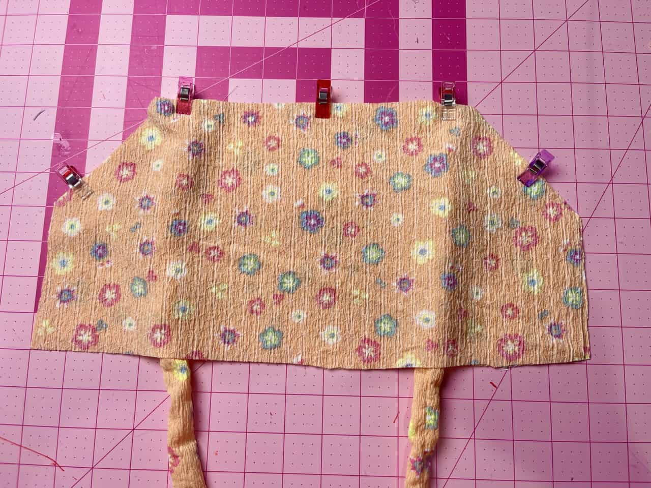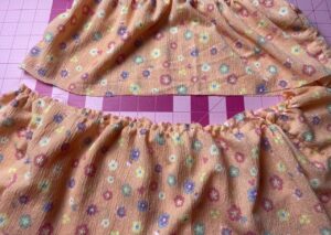 6. Take the front and back tier 1 of the dress and stitch them together at the sides. Create gathering stitches at the top of the tier 1 and use Clover Wonder Clips to hold it in place the right sides together.