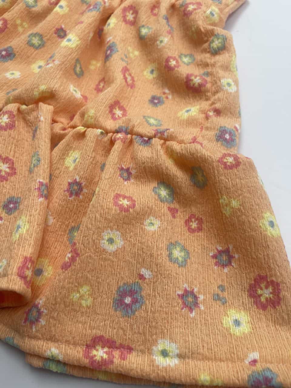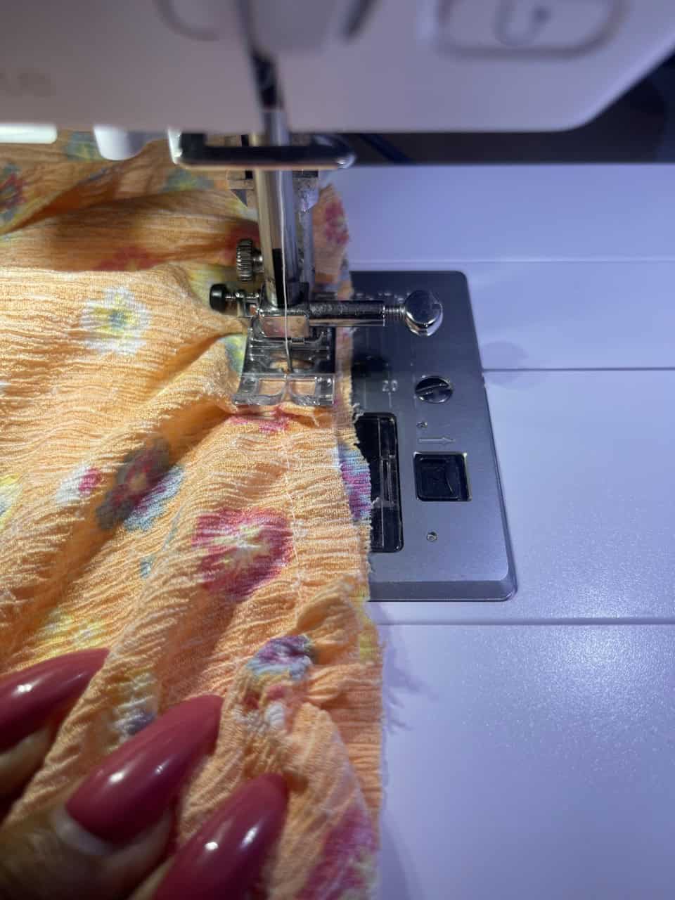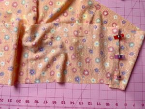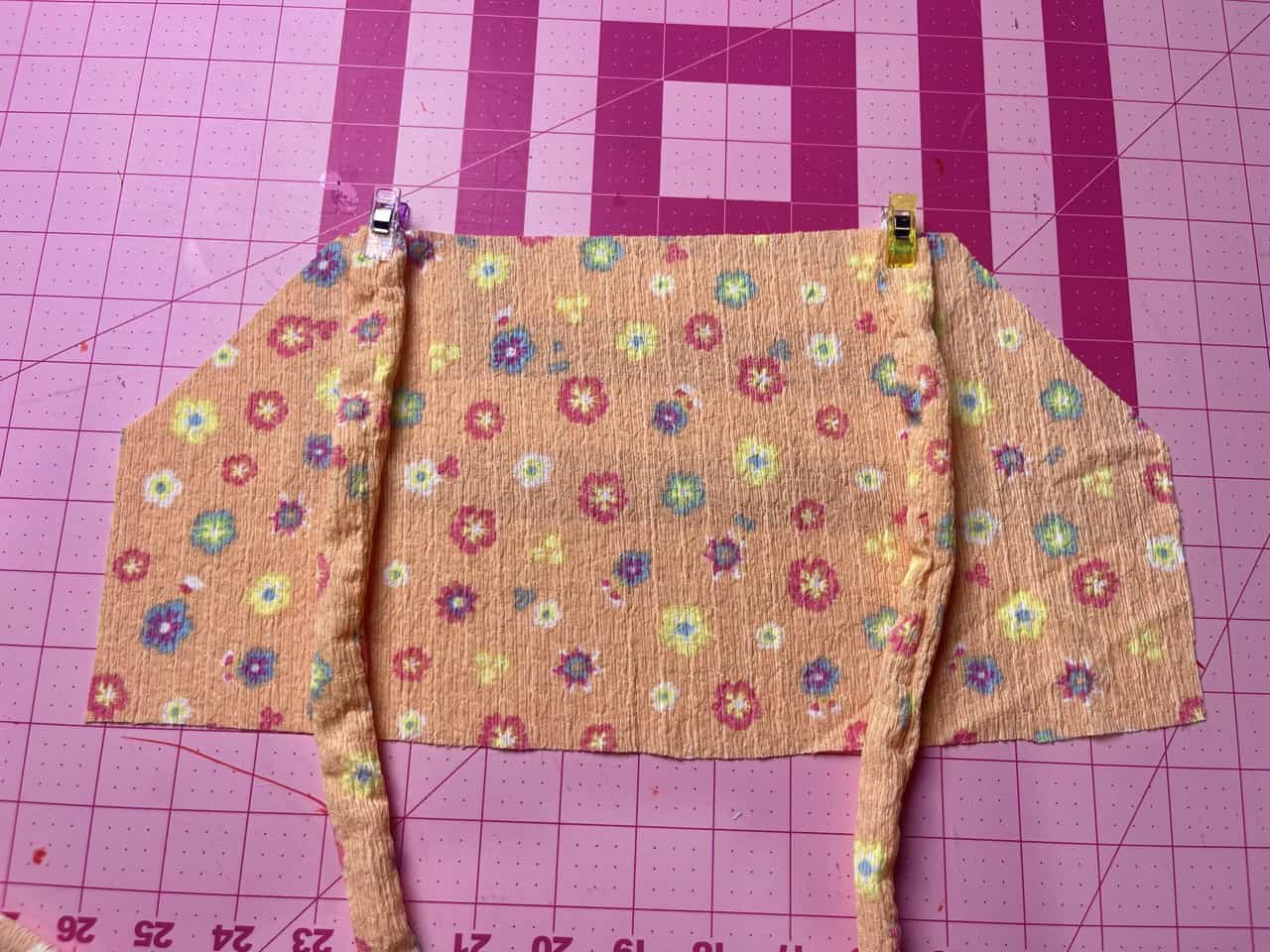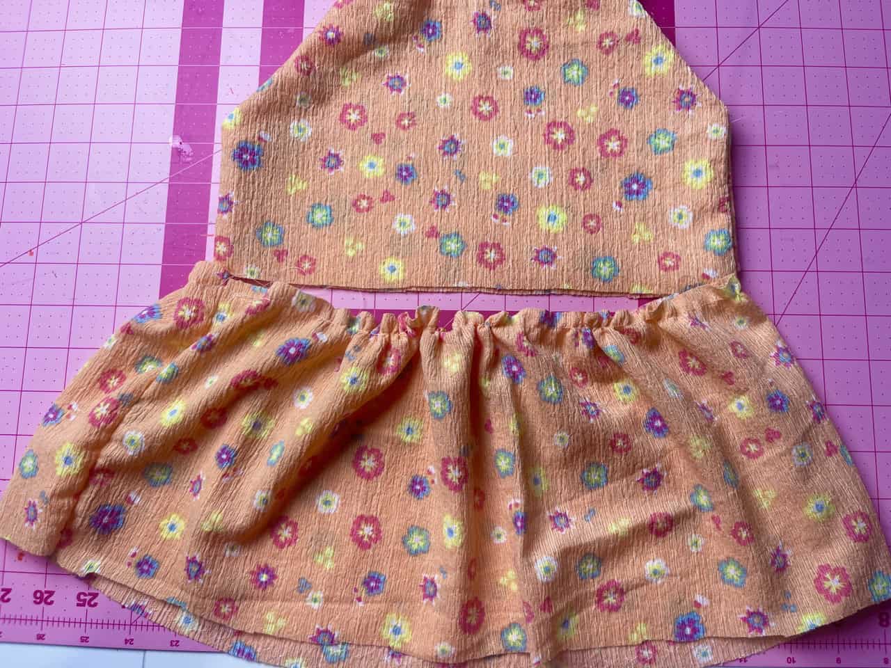 6. Take the front and back tier 1 of the dress and stitch them together at the sides. Create gathering stitches at the top of the tier 1 and use Clover Wonder Clips to hold it in place the right sides together.