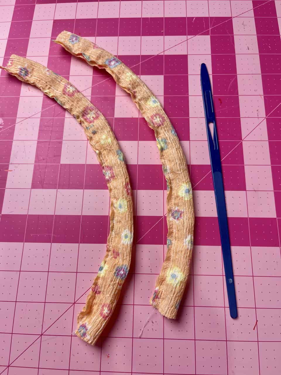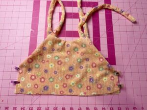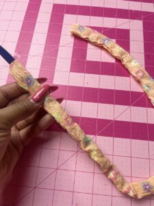 2. Take the pieces for the straps and fold lengthwise with the right sides together. Stitch using ?” seam allowance.
