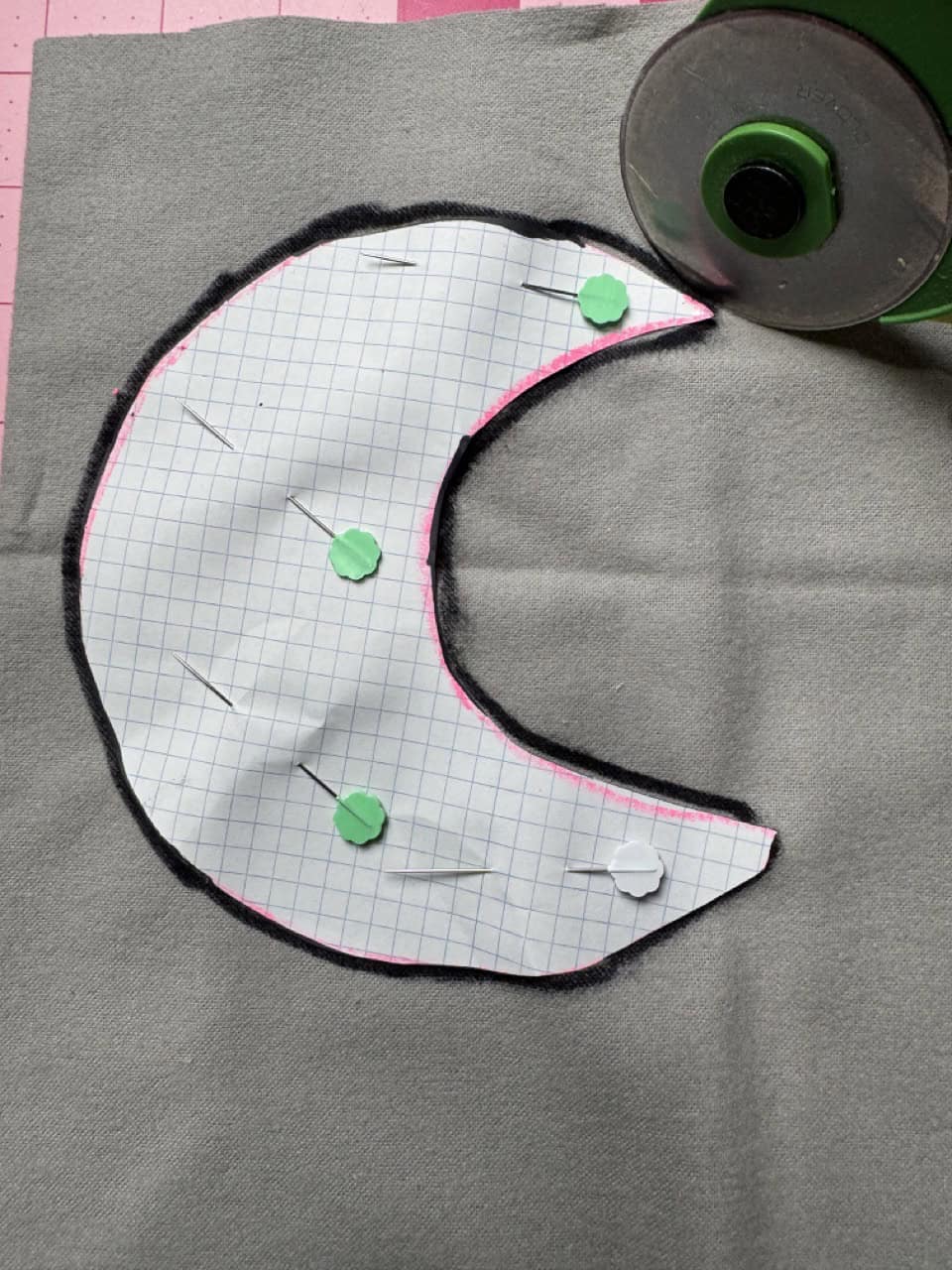 2. Cut out the shapes or designs using the Clover Rotary Cutter and Clover Flower Pins. Make sure to layer the fabric so that you get two of each side.