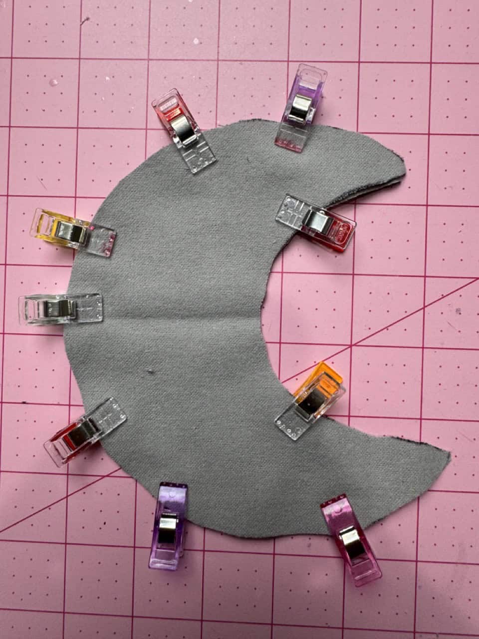 3. Place crazy glue around the edges of one side, leaving a small opening. With the wrong sides together, put the two layers together. I used Clover Wonder Clips to hold the shapes in place as the glue dries. Take pieces of the yarn and stitch in place on the top and bottom ends.