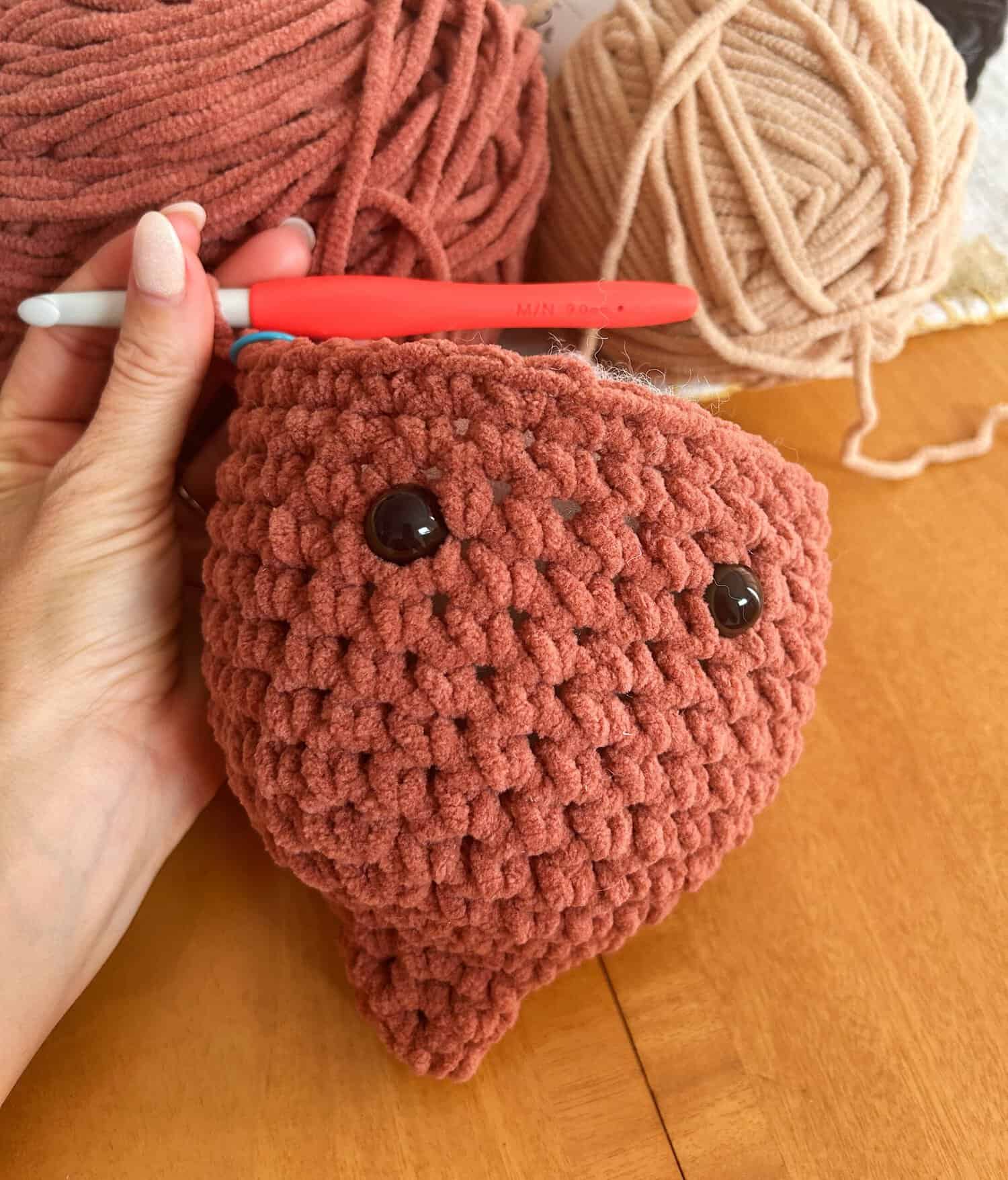 - **Insert eyes before starting on top of acorn. You will place them between rows 13 and 14 spaced out between 4 sts.
