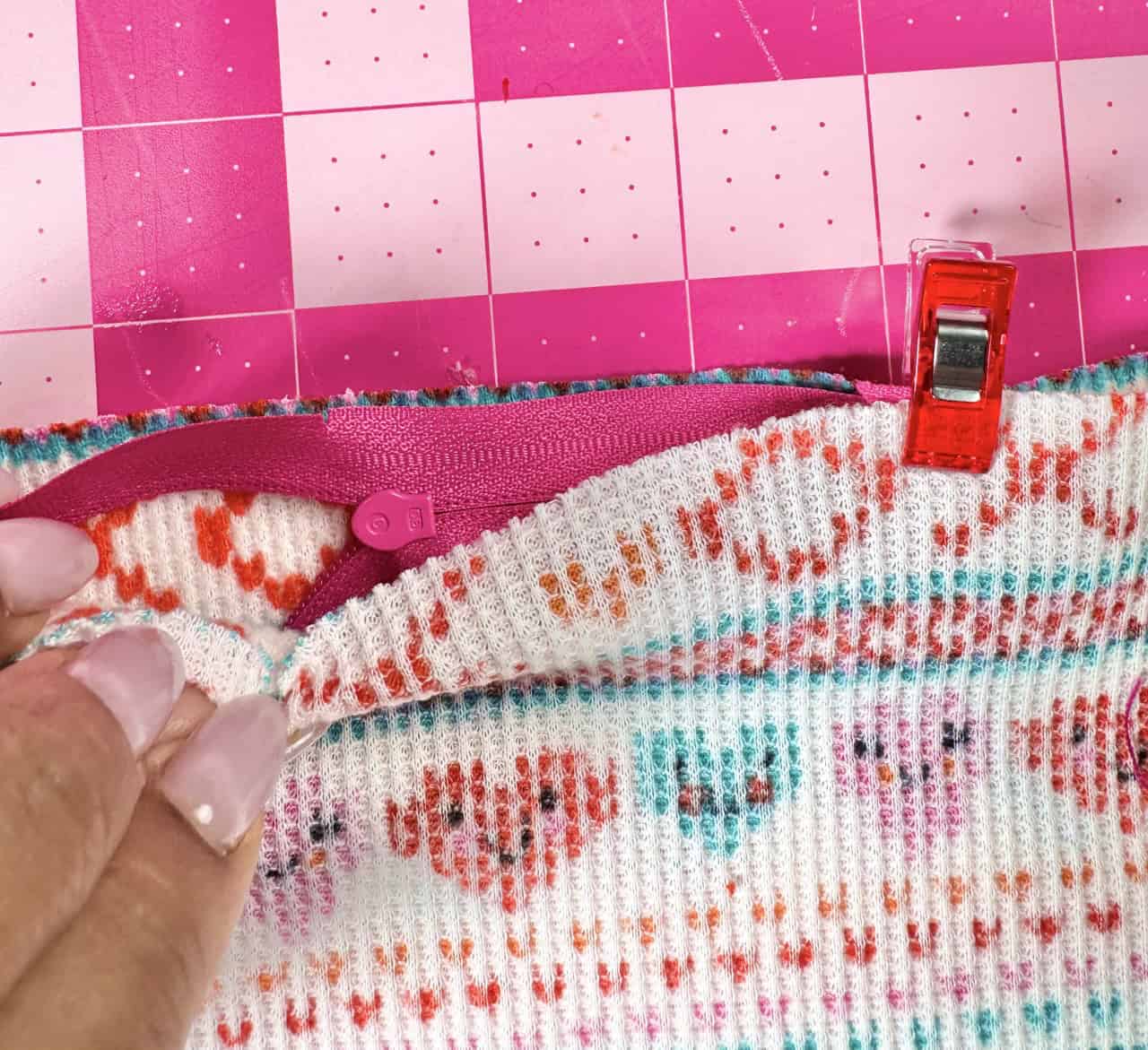 4) With right sides facing, fold the fabric width wise and match the other side of the zipper to the edge of the outer fabric. Do the same with the lining, but bring it around to the other side of the zipper. Use Clover Wonder Clips to hold in place. Stitch the zipper and fabric together.