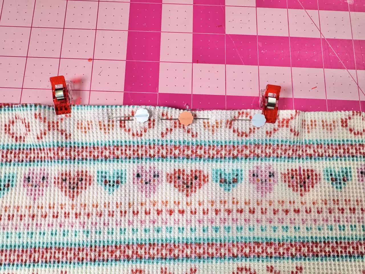 2) Place zipper at the center wrong sides up on shorter side of the right side of the fabric. Place the other fabric right sides facing on the zipper. Use Clover Flower Pins to hold in place. I used the Clover Wonder Clips to mark the ends of the zipper. Sew the zipper in place using your sewing machine.