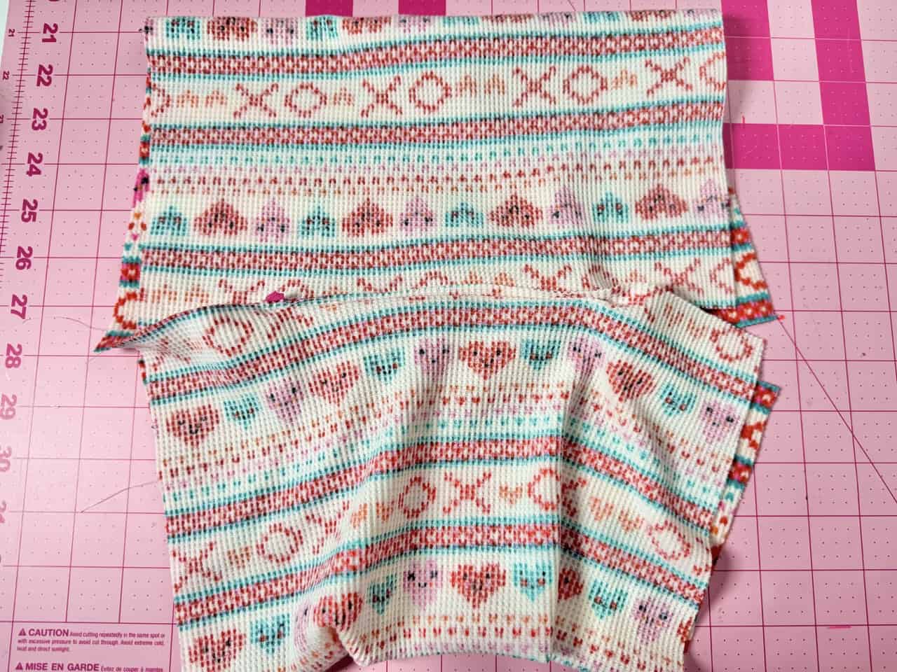 7) Turn right sides out. Fold edges of fabric ½” to the wrong side on the sides opposite each other. Hold in place and stitch around.