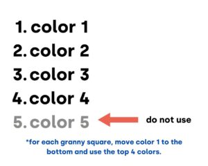 *Note: For each round/color change, join the new yarn into the ch-sp on the opposite side of the square. This will allow you plenty of room to crochet over (or weave in) the yarn tails. Each “cluster” will be worked into the next ch-sp.