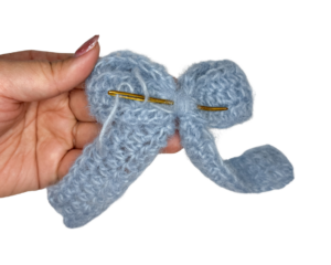 - Step 2: Use the remaining yarn tail from part 1 and tightly wrap around part 2 to create the “cinched” center of the bow.