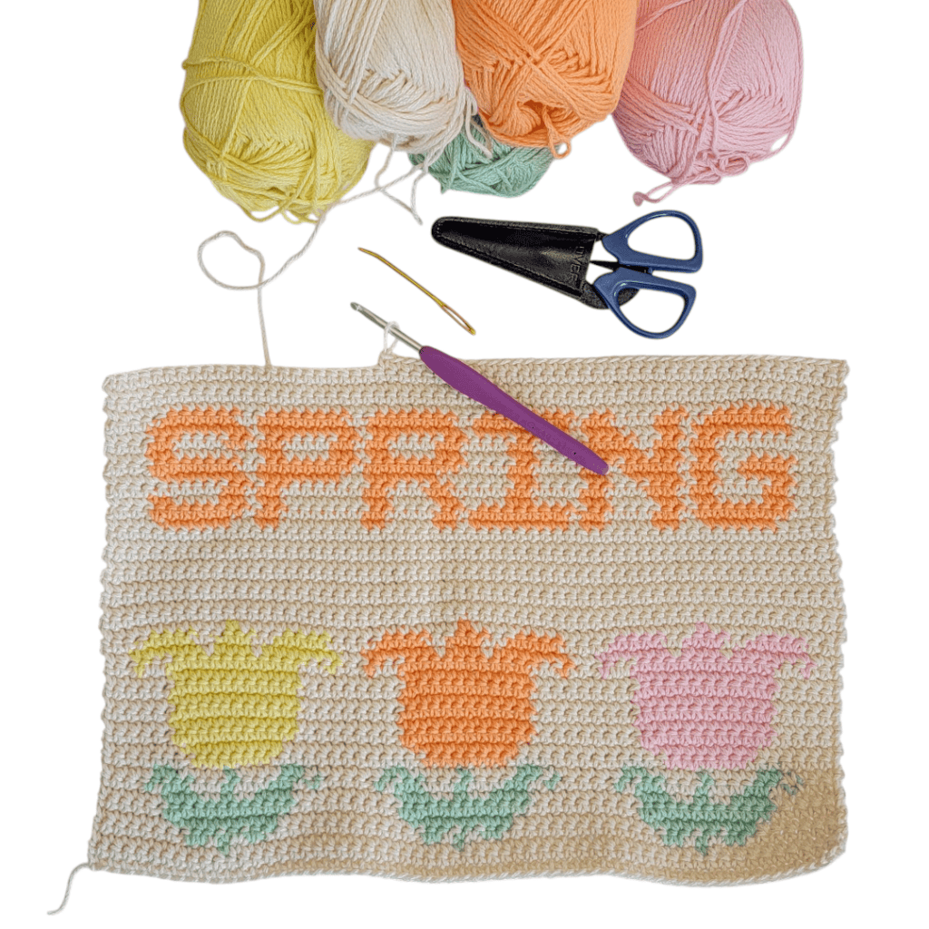 Crochet, flowers, and spring! These are a few of my favorite things! What a thrill! As spring approaches, I thought that creating a piece of decor that brightens the house, particularly the kitchen, seemed appropriate. I designed this piece, which is simple, seasonally suitable, and functional. I named it the Tulips Kitchen Towel because of the featured flower design.