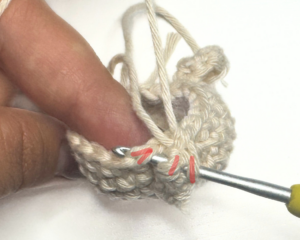 In the next rnd, we will crochet in or “join” the ears. Each ear will span 1 st. To join the piece: