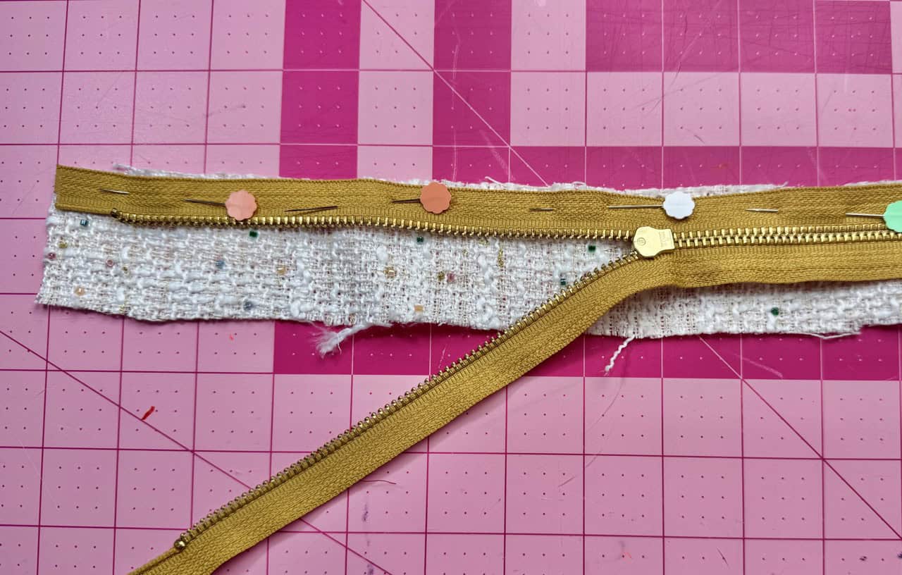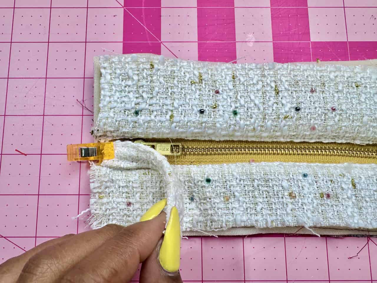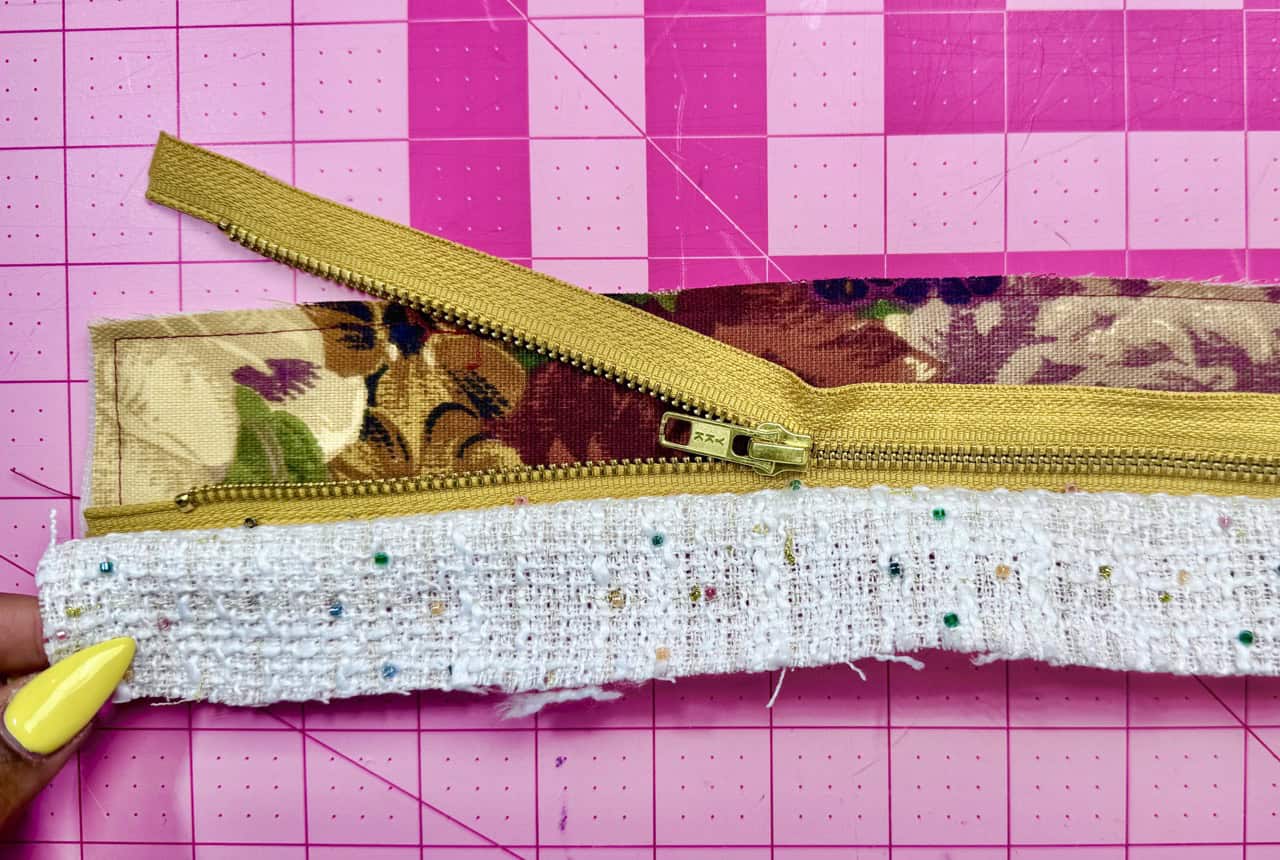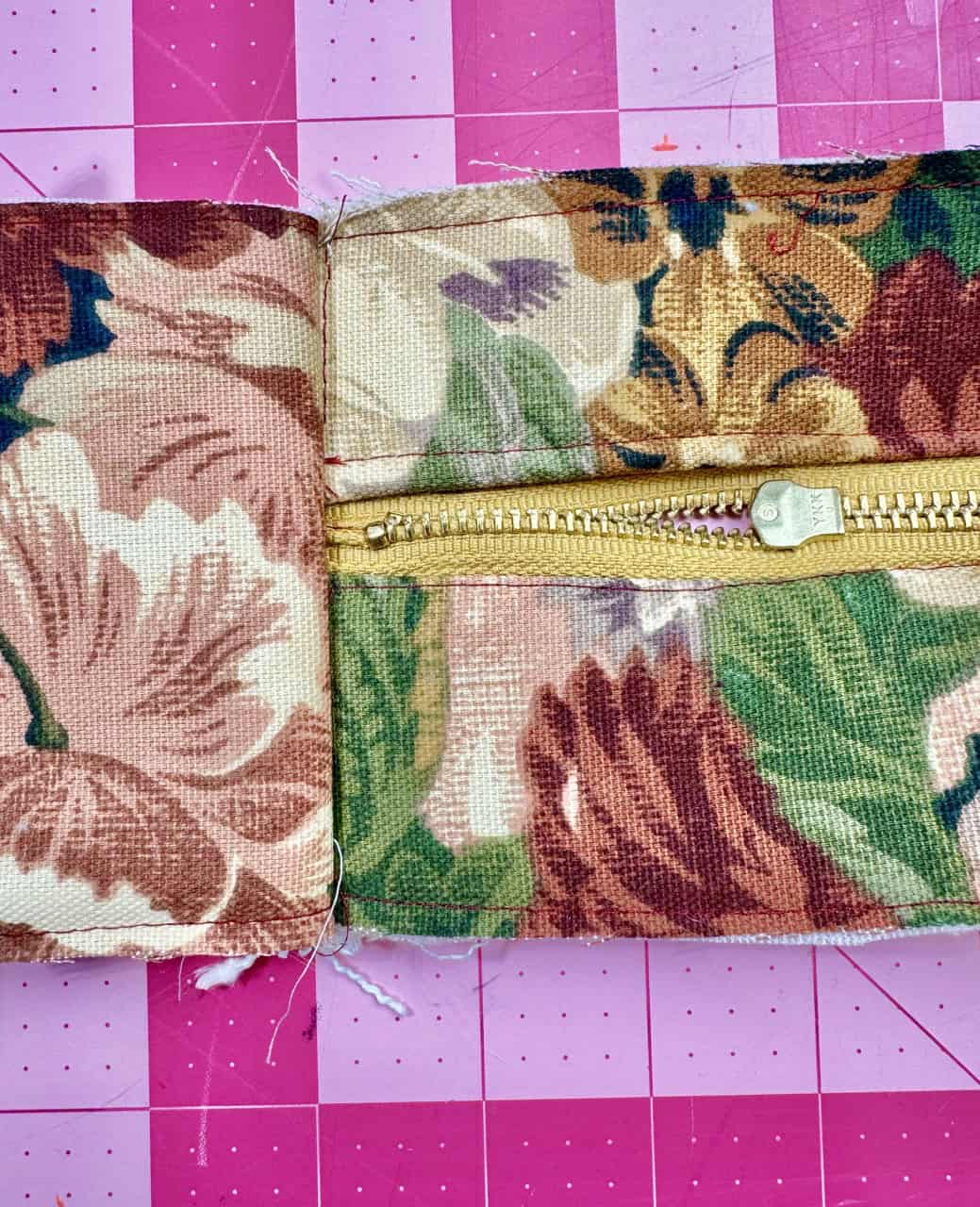 4. Attach the outer fabric piece D to the other side of the zipper with right sides together. Sew through the layers. Fold in the lining piece D about 1/2″ and use a needle to do an invisible stitch to hold it in place. I used Clover Gold Eye Embroidery Needles.