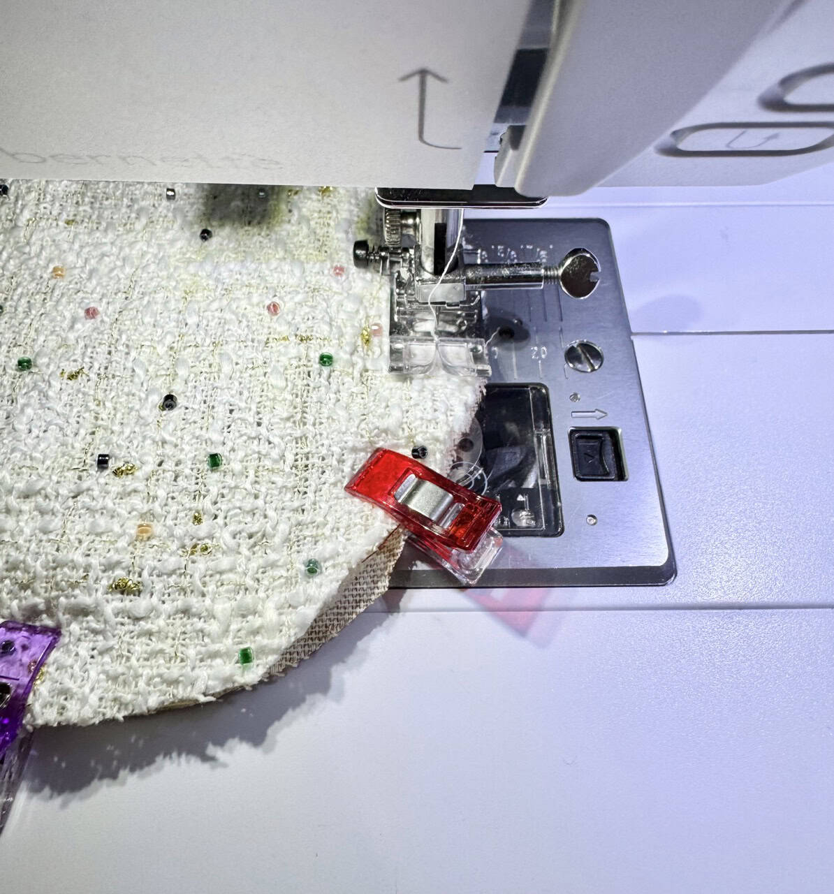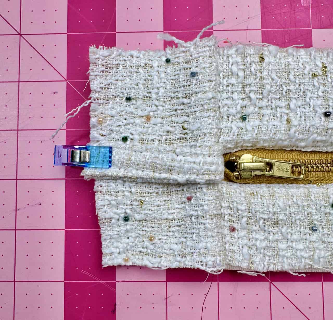 3. Create the strap using C by folding in half at the center and folding in the sides to center the crease. Iron and static along both edges. Pin the strap to the zipper panel. Place the outer fabric of piece D on the zipper panel right sides together and the lining fabric of piece D on the back right side facing the zipper. Use Clover Wonder Clips (Variety Pack) to hold in place. Sew through all the layers with a 1/2″ seam allowance. Use a clip to hold the strap on the opposite side of piece D.