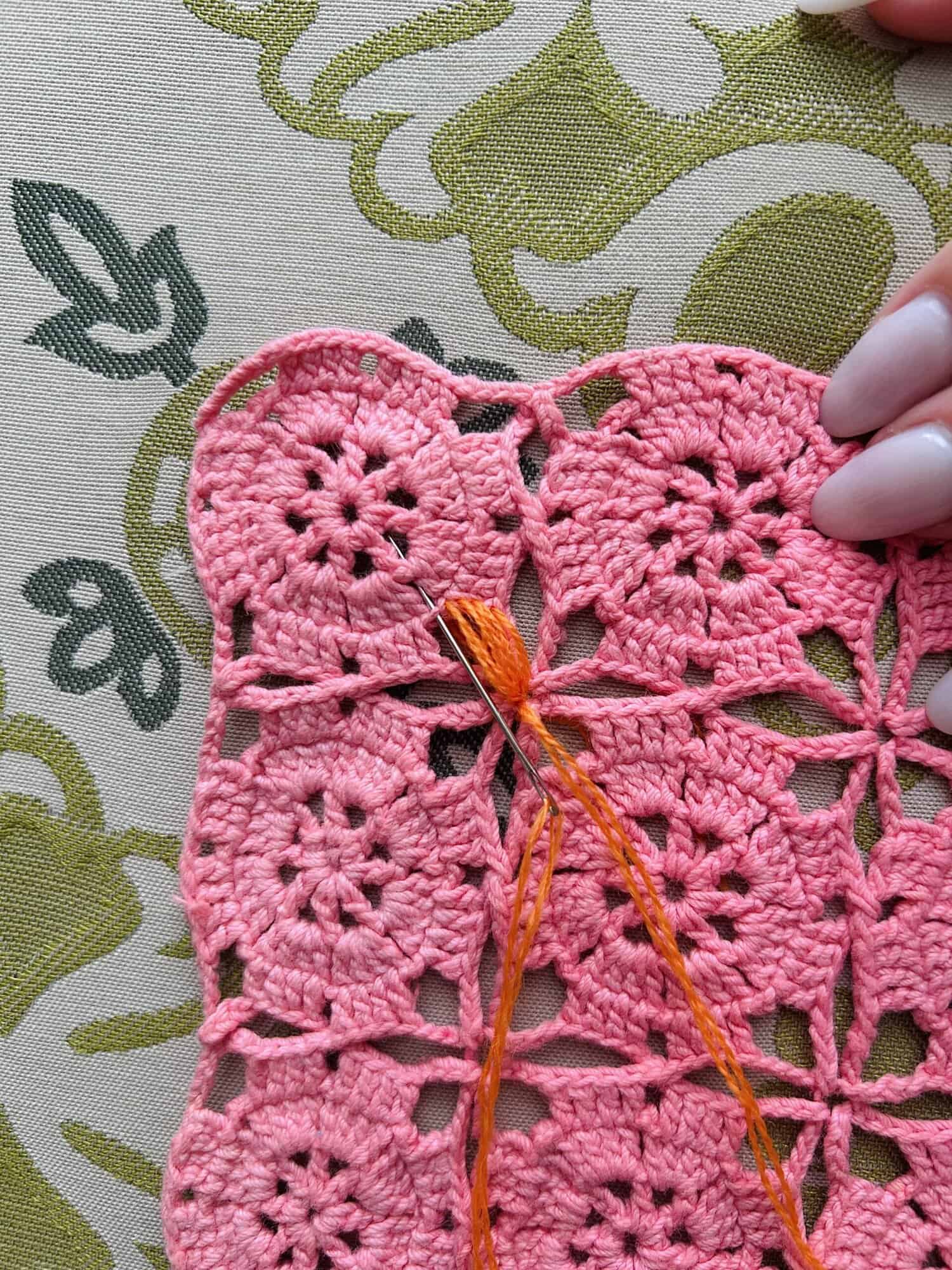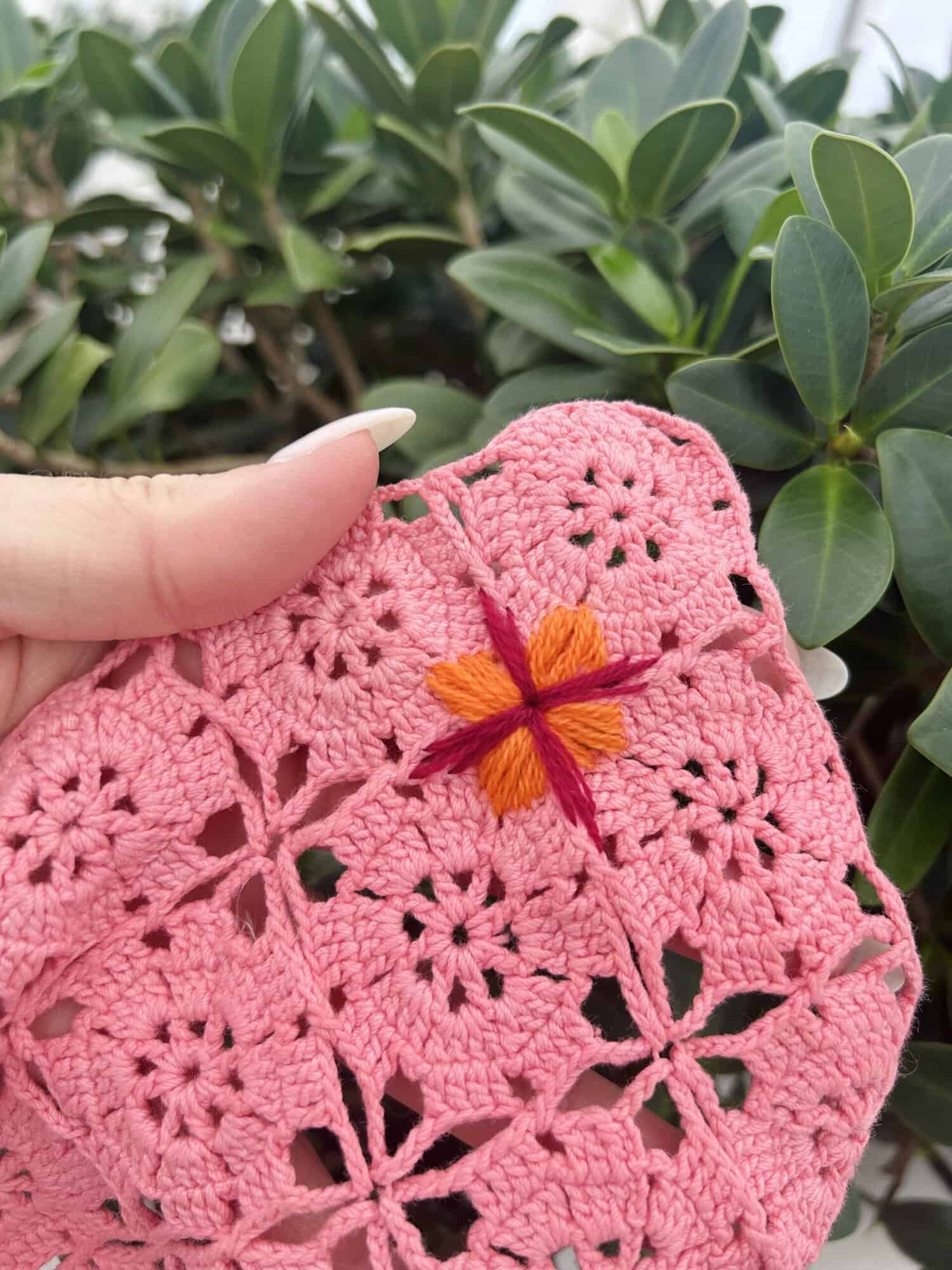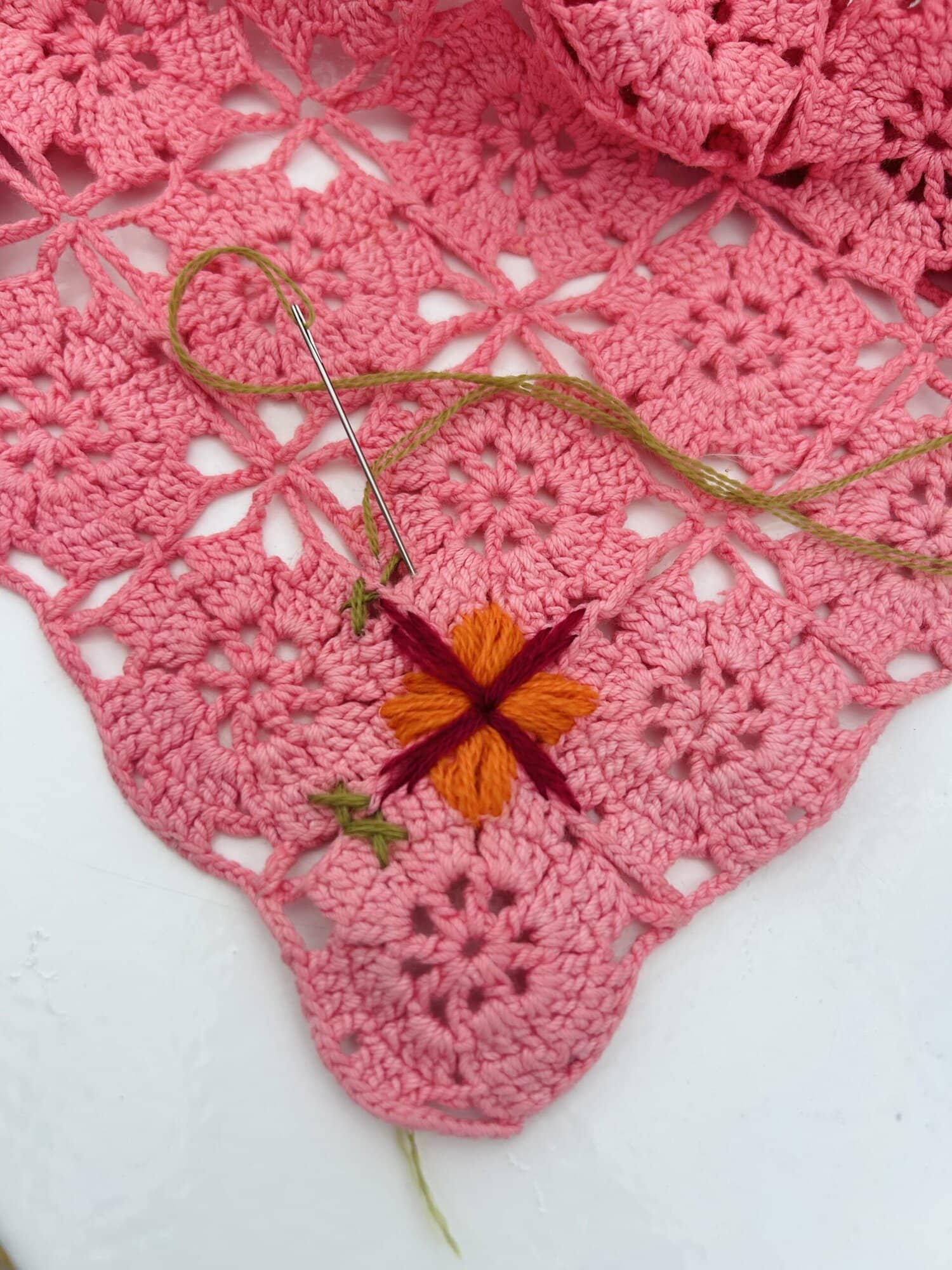 To put it to the test, I crocheted a lace rectangular swatch and decided to use the darning yarn for surface embroidery. I sketched a loose flower design and brought it to life using a tapestry needle and a few basic stitches. The yarn glided easily through the fabric, adding a pop of color and texture that really stood out against the crochet backdrop.