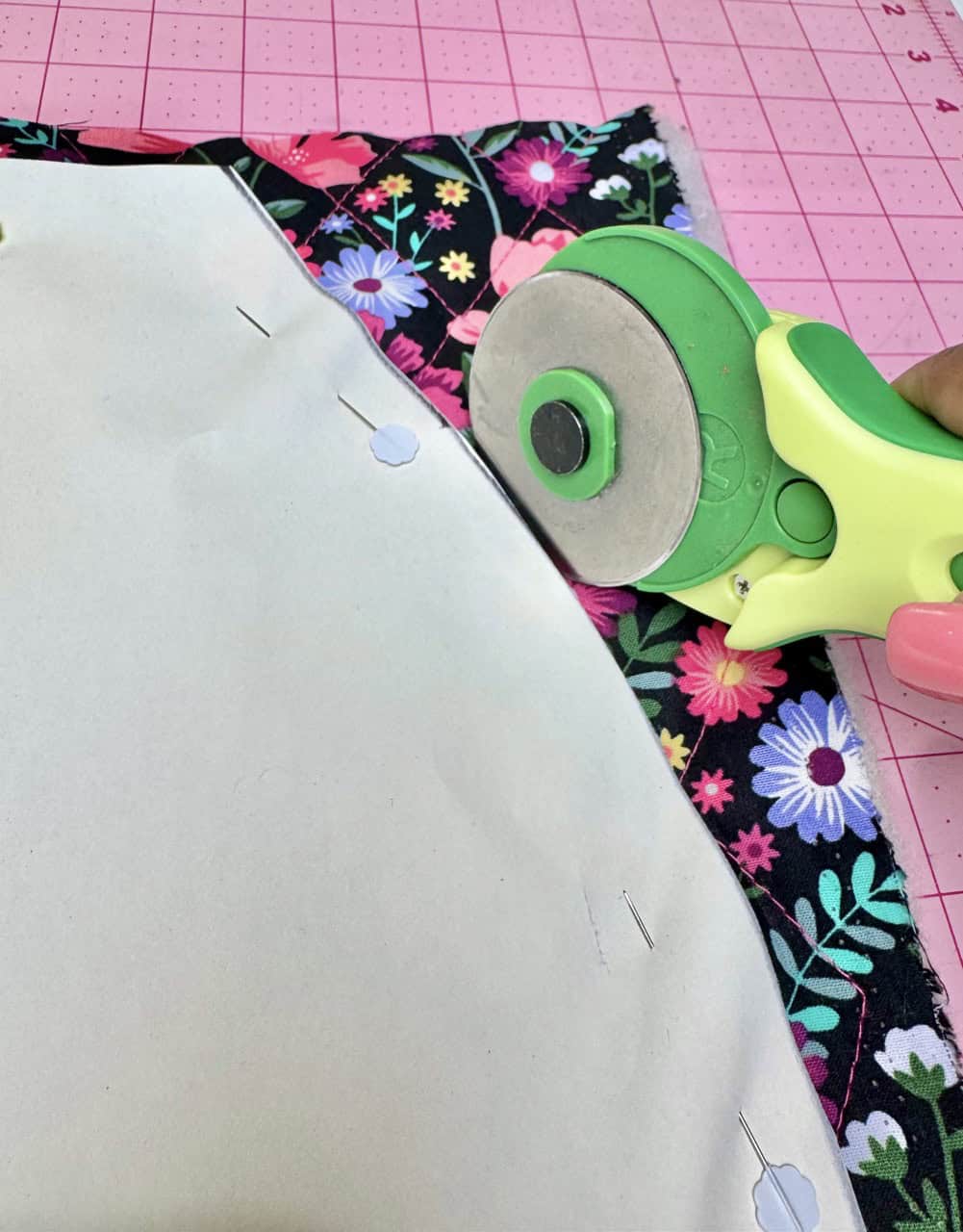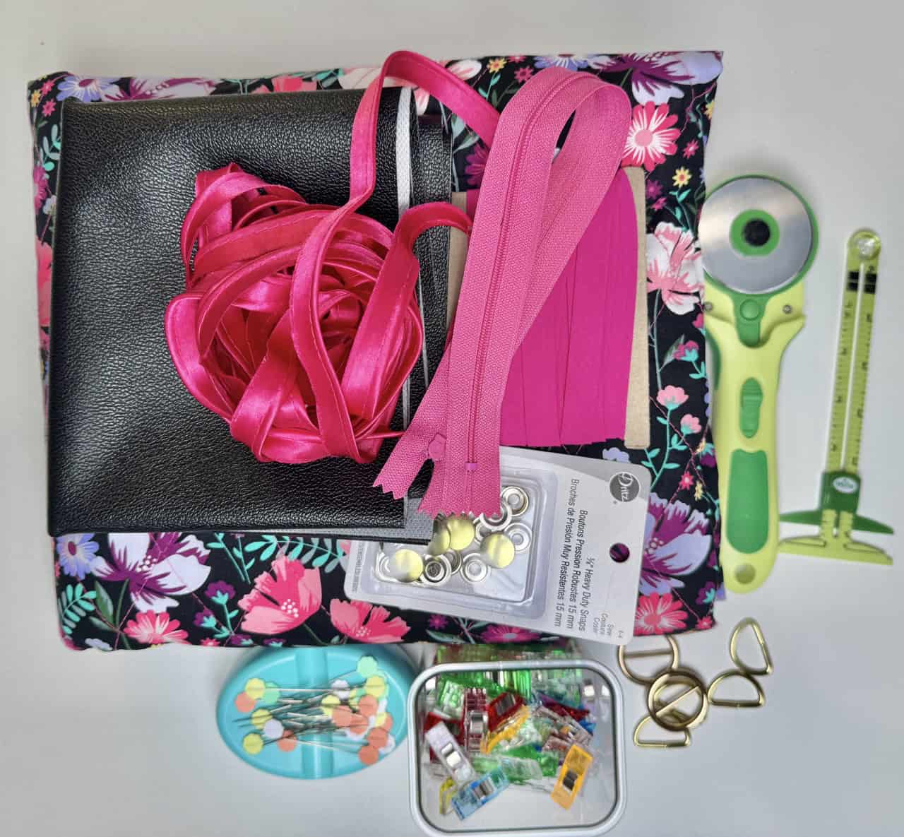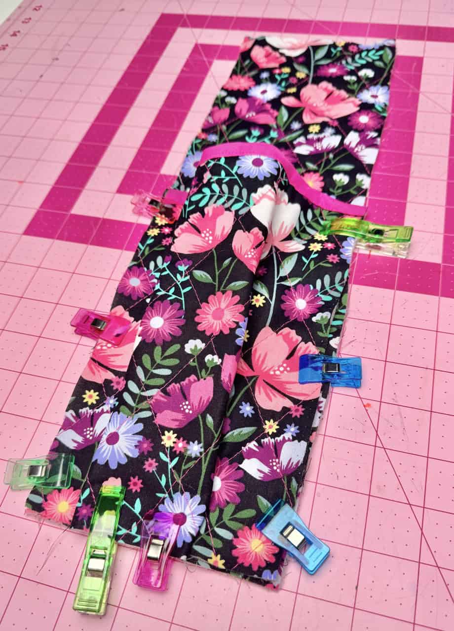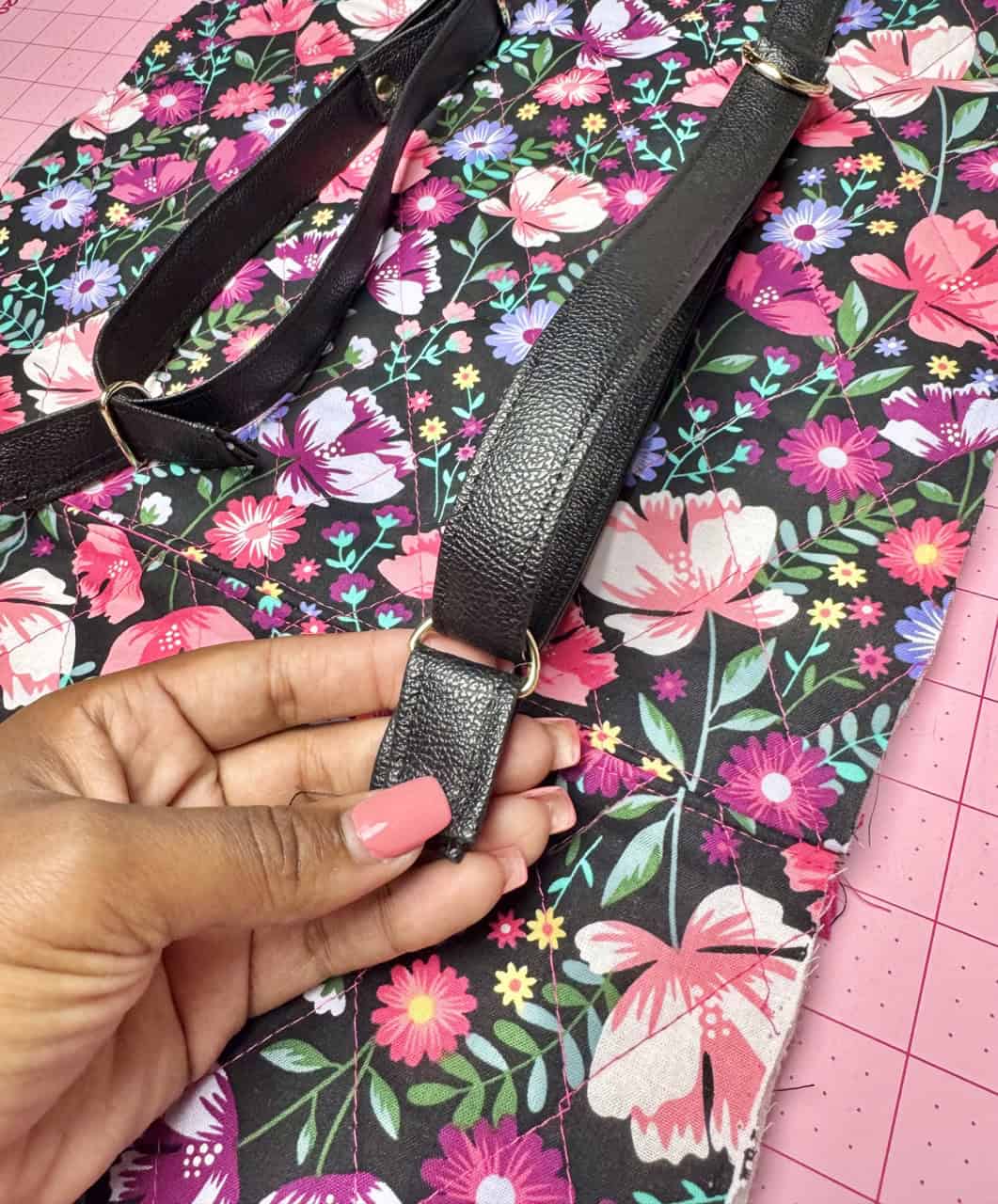 Cut out the pieces with the fabric, remember to cut out the bag straps with a contrast fabric. I used Clover Flower Pins to hold the pattern pieces to the fabric! I really liked using faux leather for the straps, but canvas is also a good material to use. I used the Clover Rotary Cutter (60 mm) because it works very well with bulky fabrics. The main bag fabric was already sandwiched with batting, so I did not have to use batting. I also loved the wrong sides of the bag fabric and wanted to use that as my “lining”.