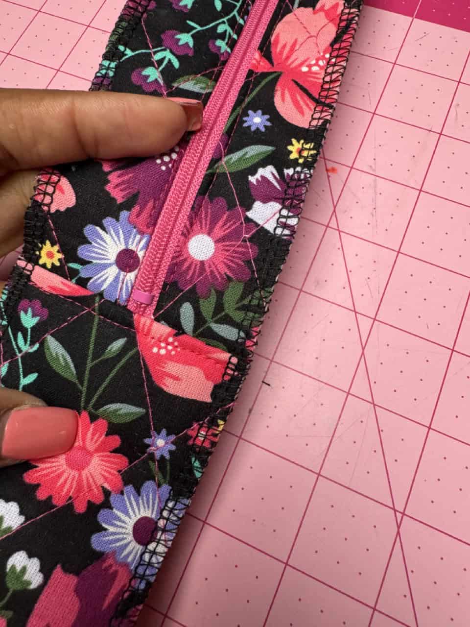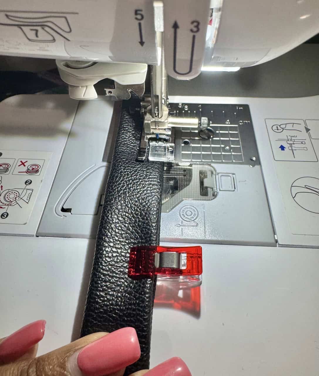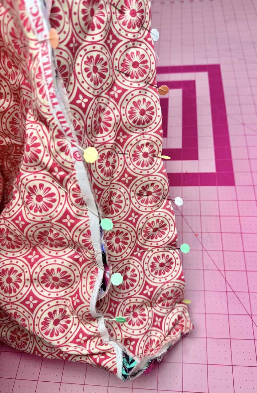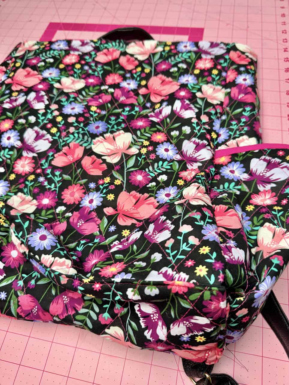 Cut out the pieces with the fabric, remember to cut out the bag straps with a contrast fabric. I used Clover Flower Pins to hold the pattern pieces to the fabric! I really liked using faux leather for the straps, but canvas is also a good material to use. I used the Clover Rotary Cutter (60 mm) because it works very well with bulky fabrics. The main bag fabric was already sandwiched with batting, so I did not have to use batting. I also loved the wrong sides of the bag fabric and wanted to use that as my “lining”.