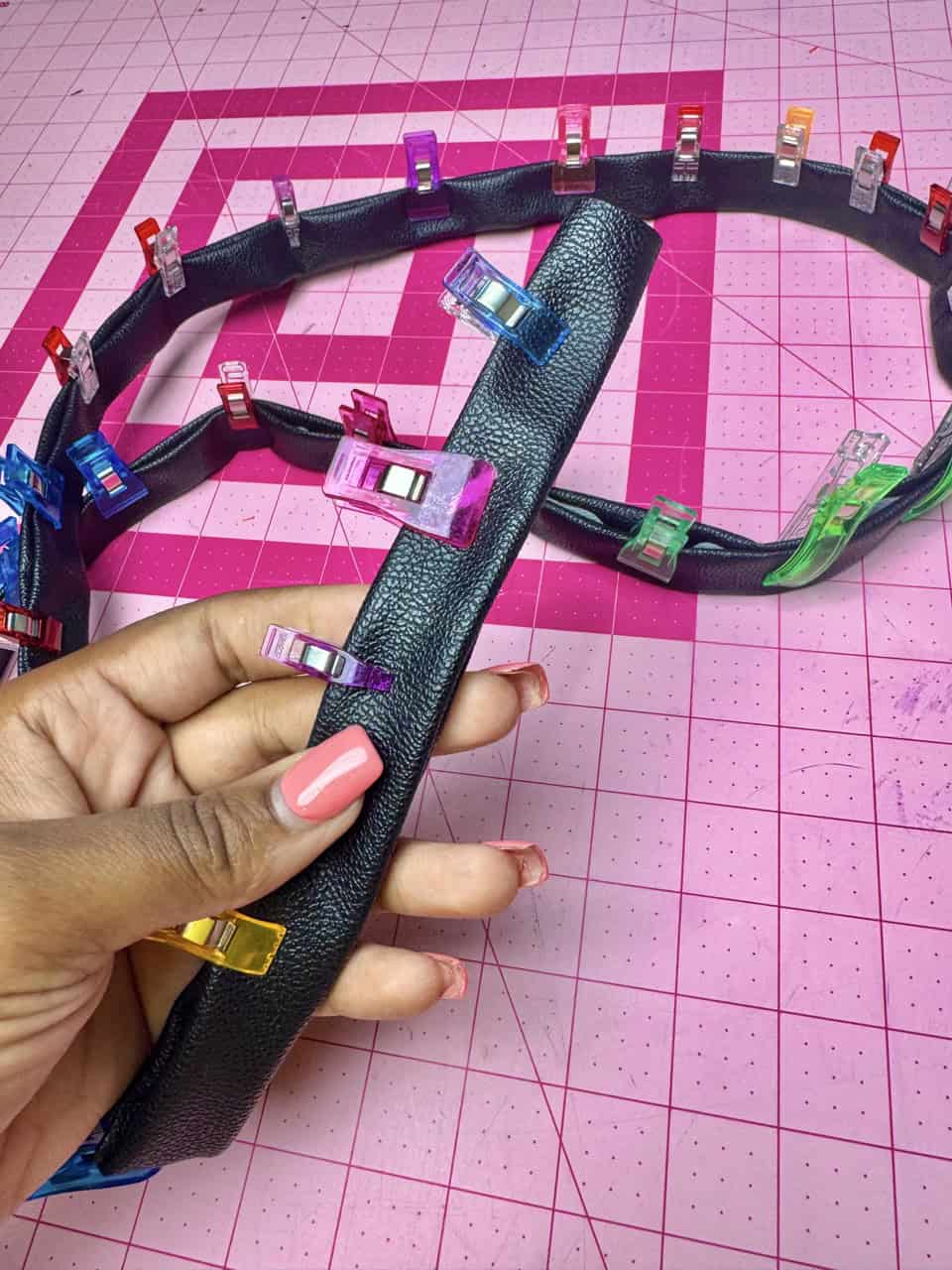 2. Create the straps. I don’t know what I would do without the Clover Wonder Clips. These were amazing for the straps because the straps were extremely thick and the pins were not able to penetrate through the straps. I wanted continuous straps, so I cut out 4 strap pieces and create two long straps, then folded them in 1/2 in on both sides, sandwiched them together and edgestitched on both sides. Then, added the adjustable sliders and D-rings. The tabs at the bottom is optional, but if you would like to use them, they need to be the same width as the straps.