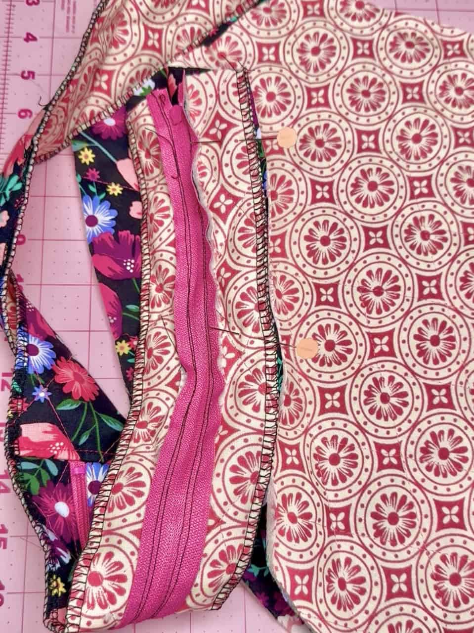 5. Now moving on to create the tennis racket bag, start with the zipper. Open up the zipper and place the zipper panels right sides with the zipper. Do this to both sides. Attach the racket bag side panel to the zipper panels, right sides facing. Topstitch the seam toward the side panels. You may need to trim the sides to make sure they are both the same width. For this size, you can fit two rackets. If you want to only fit one, trim it down 1/2 in on both sides.