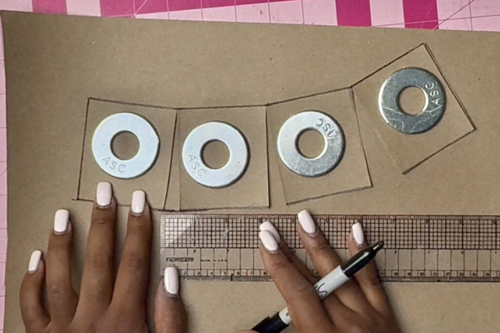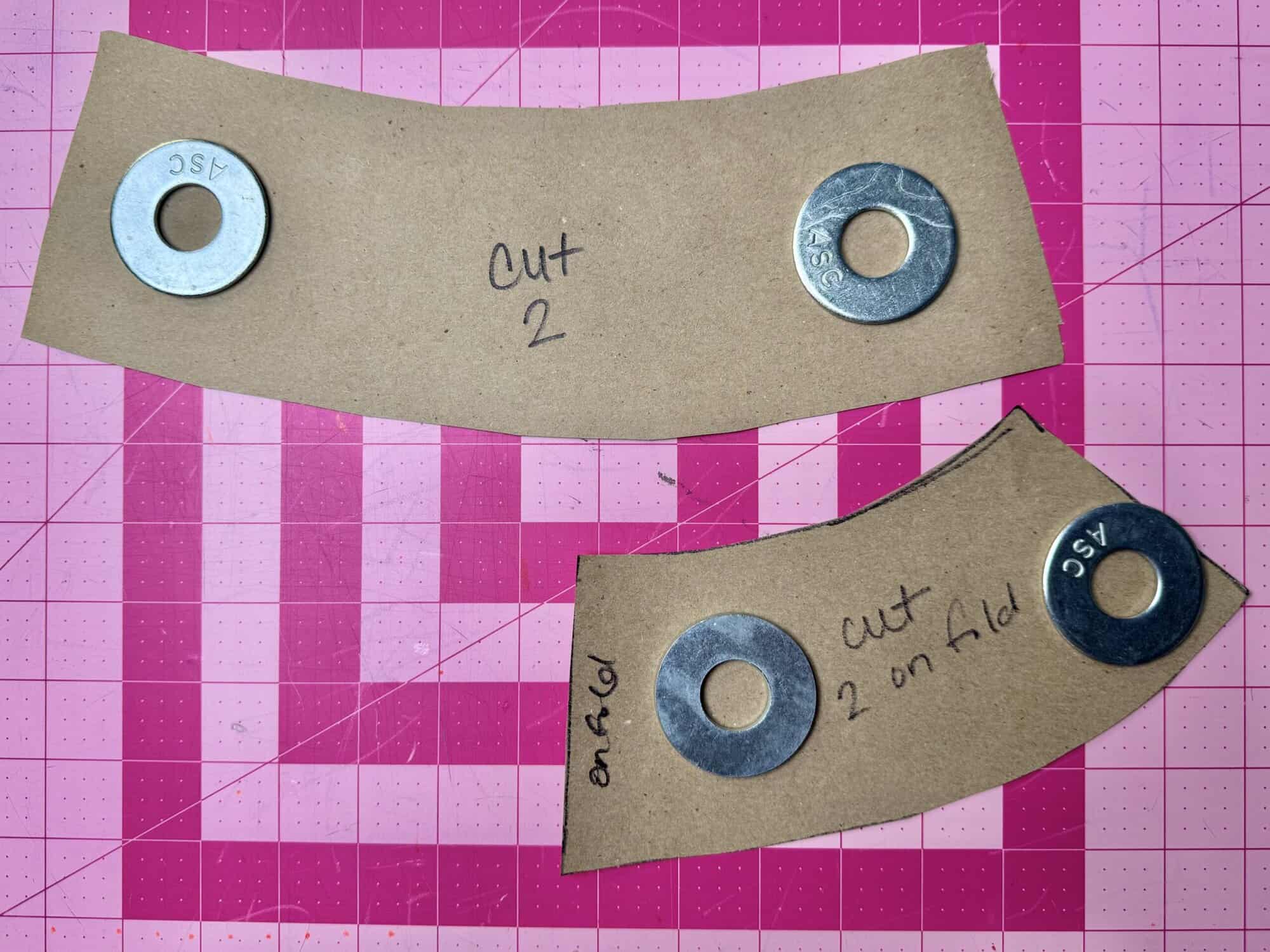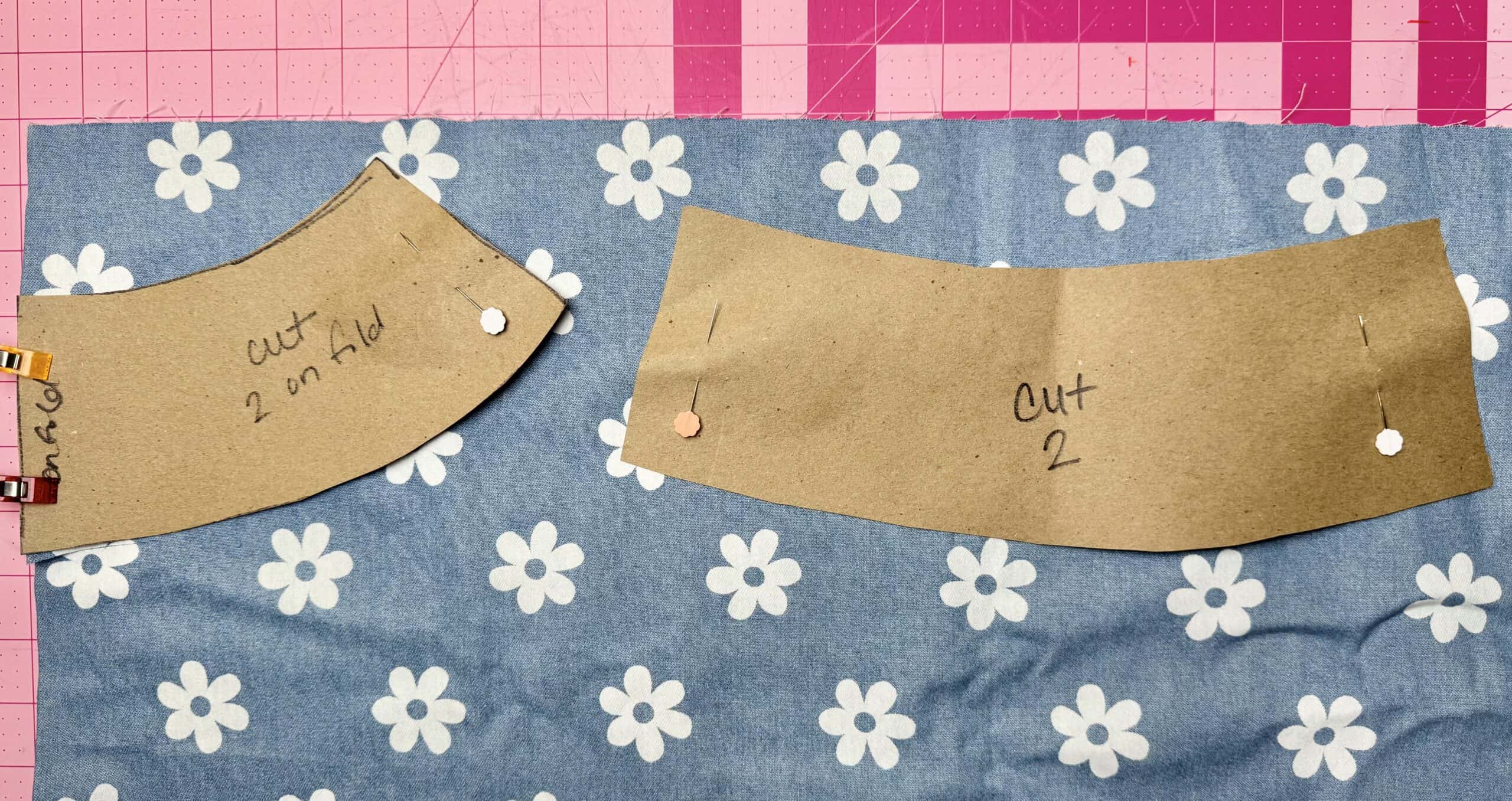STEP 1: Draw the pieces for the pattern of the open-top bucket hat. The measurements for the hat circumference is 10 inches x 3 inches and the measurements for the brim is 6 inches x 3 inches. To create the curve of each piece, fold the pieces into 4 even pieces and cut at the fold from one end of the other without separating the pieces. Use that to curve the pieces, leaving ½” in between each new piece. The brim will be on the fold. Cut the new pieces out, using the Clover Flower Pins, leaving ½” around each piece as the seam allowance. You can use the Clover 5-in-1 Sliding Gauge to create the seam allowance. These are going to be the pattern pieces.