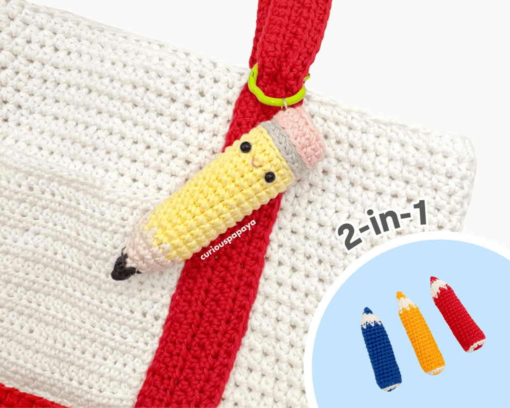Bag charms are sooooo IN right now. Here’s a fun back-to-school themed make – and a bonus, it’s a 2-in-1 crochet pattern!!