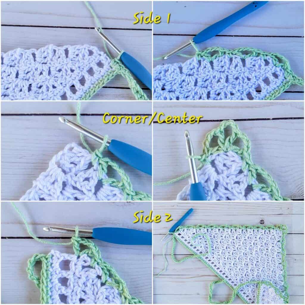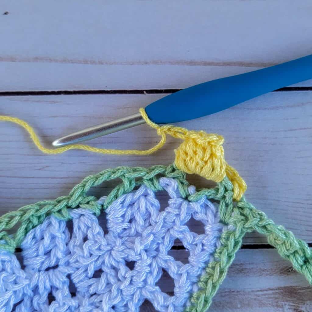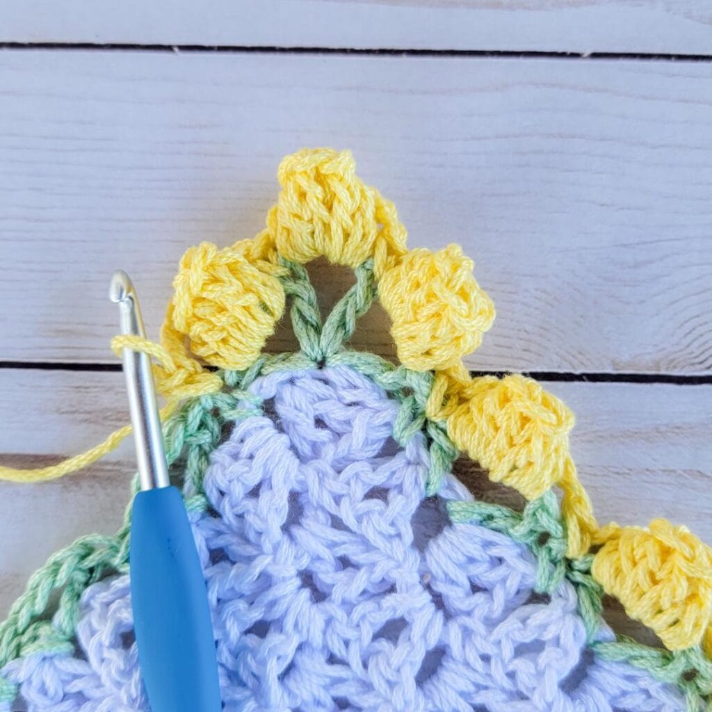 - Step 1: Side 1 of the Triangle. Attach yellow yarn (or your chosen color) into the 1st st, *1SC in 1st st, ch3, sk 1 st, PC in ch-3-sp, ch3 sk 1 st, *1SC in next st, ch3, sk 1 st, PC in ch-3-sp, ch3, sk 1 st; Rep from * to last SC st