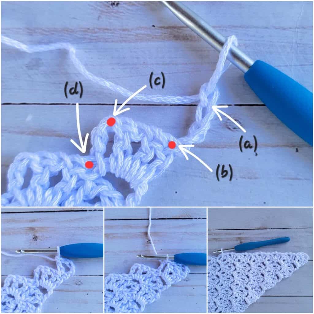 - Row 18: Please refer to the photos below. (a) Ch4 (count as 1DC + ch-1-sp), (b) 1DC in 1st st, *(c) slst into top of next ch-3-sp, (d) V-st in next st; rep from * to end of row and turn.
