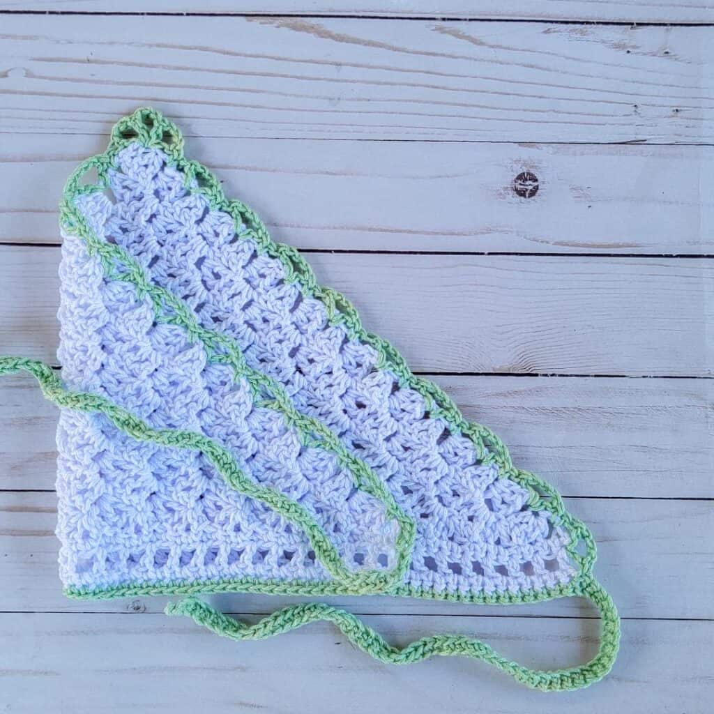 Within the crochet world, the Corner to Corner (C2C) stitch pattern is very popular. The name comes from the fact that it is worked diagonally, starting from one corner, increasing to the widest point, and then reducing back to the opposite corner. However, since we just need to make the bandana’s triangle (base), there is no need to reduce with this design. Each diagonal block of the C2C pattern is composed of a chain of 3 and V-st (1DC, ch1, 1DC). After the row is finished, you turn and work more blocks into the spaces on either side of the block from the previous row. Although it appears somewhat difficult, working on this stitch is actually quite enjoyable and simple. It’s ideal for big projects because of its straightforward repeating pattern that allows you to work without thinking or counting too much!
