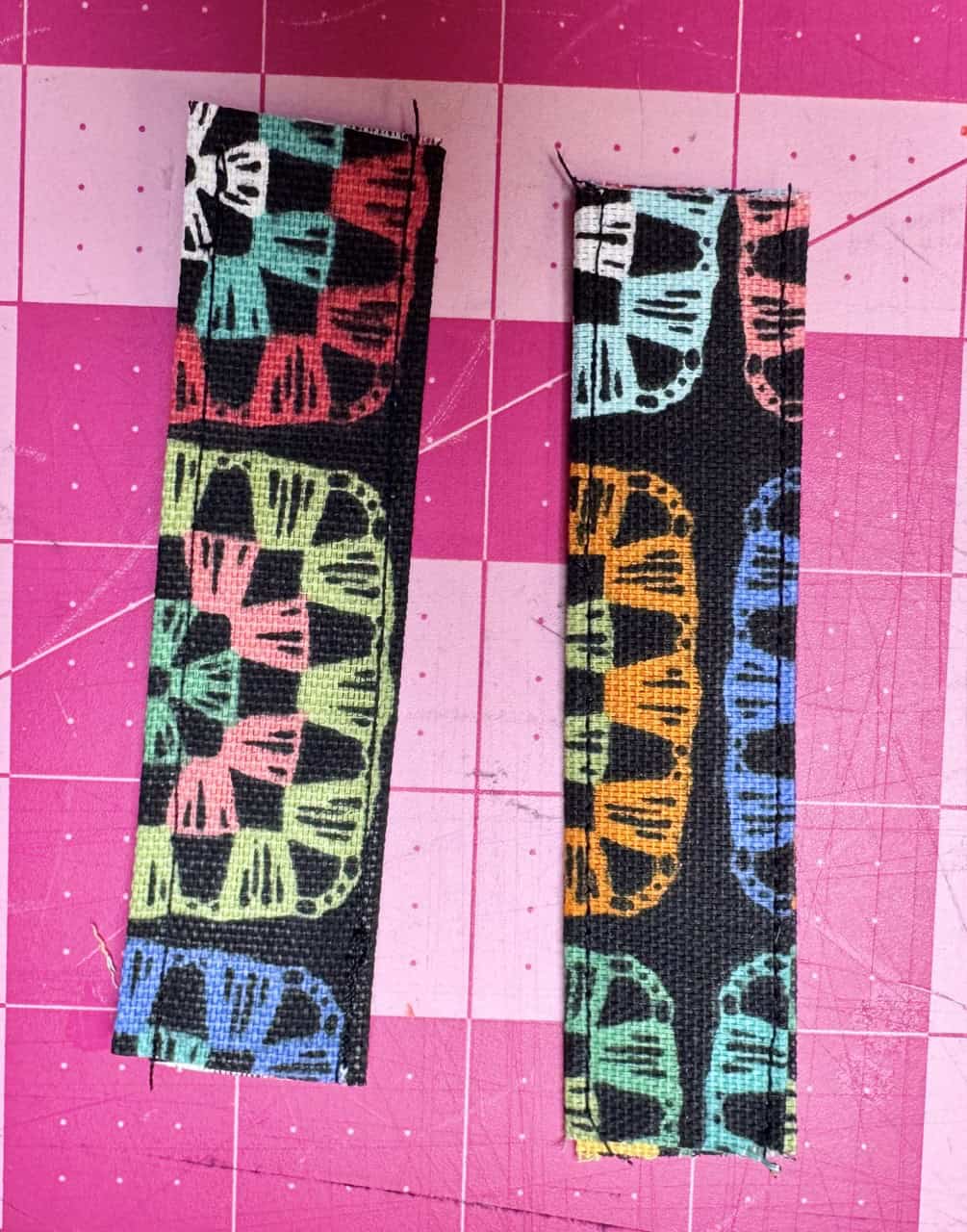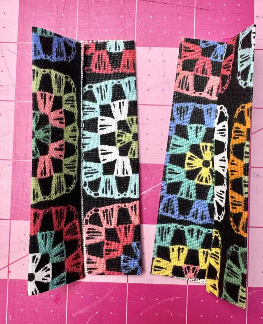 2) Make the tabs. Fold raw edges of the tabs (3) in by 1 inch, press, then fold in half again. Press and topstitch close to the folds. Finished tabs will measure 1 in x 4 in.